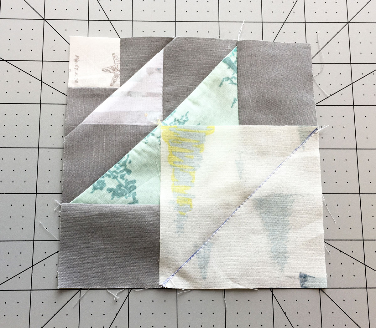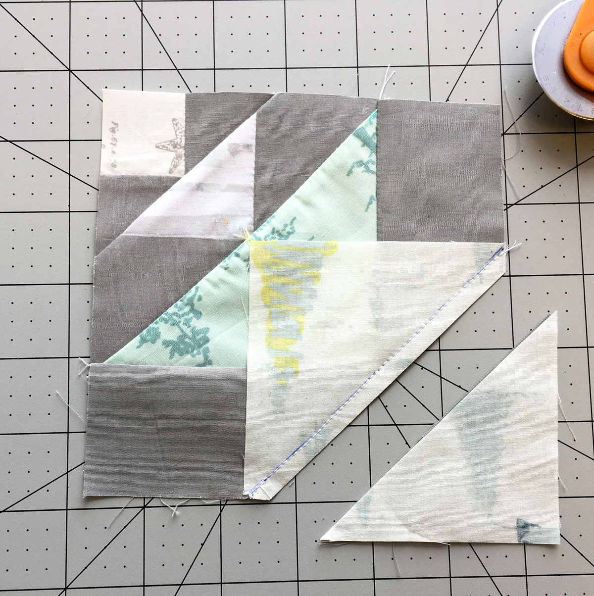 Finish off your block by drawing a diagonal line on the wrong side of a 3 1/2" square from Fabric G. Place right sides together to the corner of your block. Stitch on the line you drew and trim piece to 1/4" seam allowance.