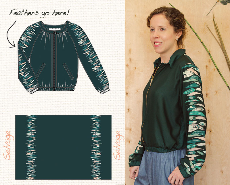 Lightweight breathable jackets are essential for Spring and going into summer. To create this look we strategically placed our pattern pieces to showcase the beautiful feather design located on either side of the panel.