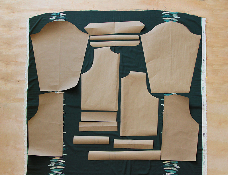 We centered both our sleeve patterns to have the feathers fall directly down the length of the arm. To incorporate more of the feathering detail into our jacket we decided to create two back jacket pieces, lining the center backs along the inner edge of feathers. When you sew up the two center back pieces it will give you a lovely mirrored effect. The rest of the pattern pieces were placed in the rich dark green center of the panel.