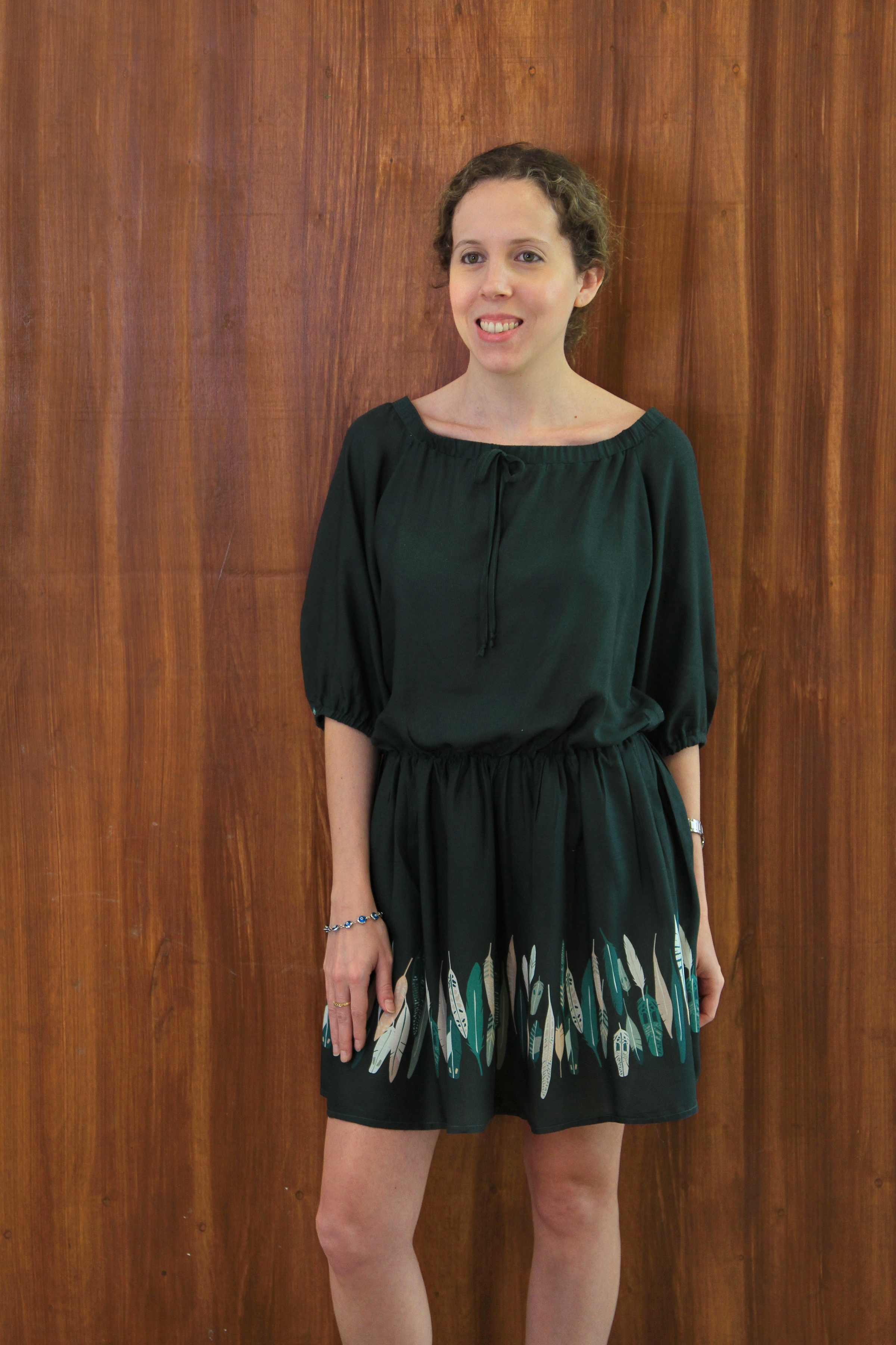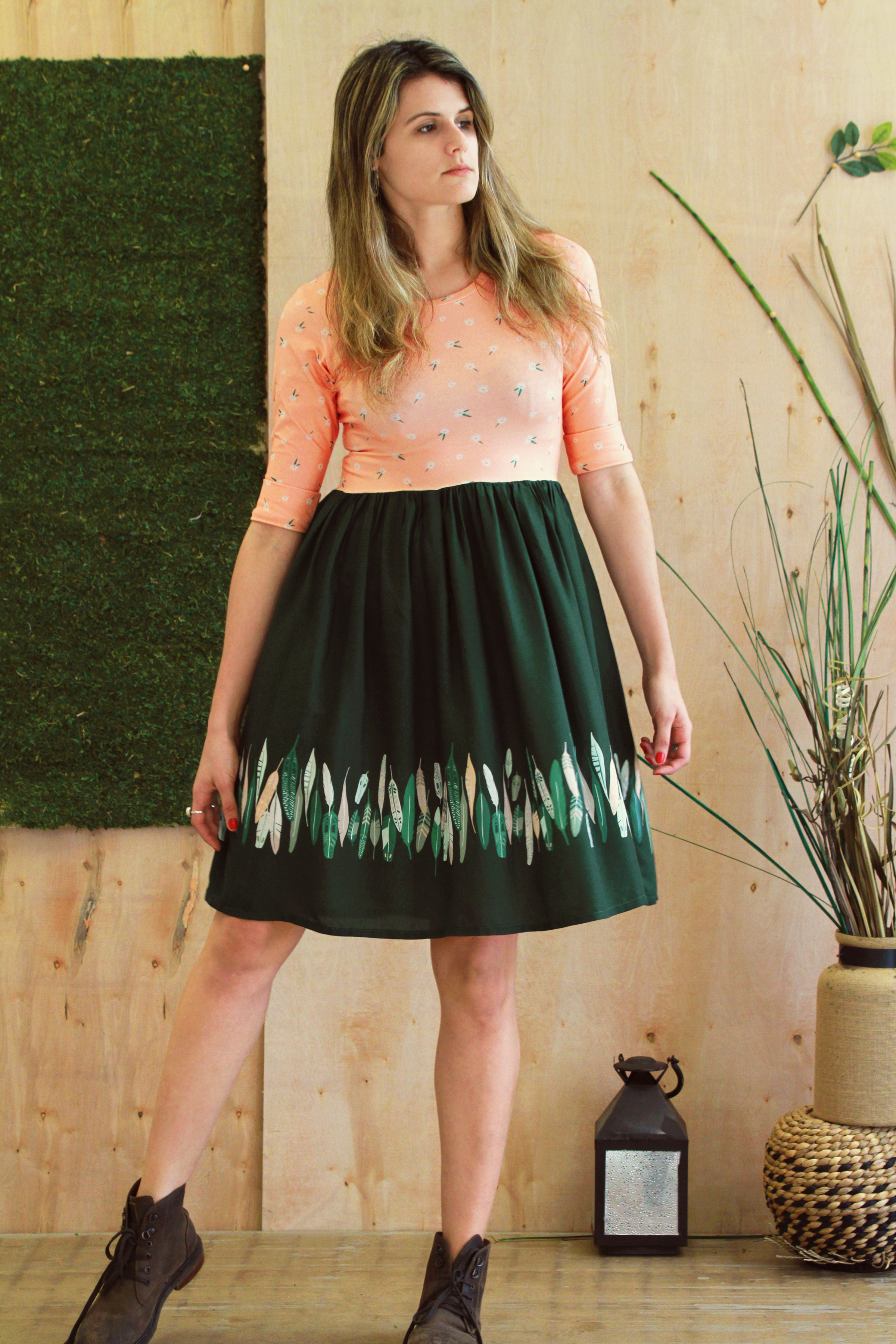 I love the boho flair of a peasant style blouse or dress. The carefree and relaxed nature of this style is perfect for weekend and travel wear! We incorporated the feather detail on the bottom skirt and used the solid dark green section of the panel for the remainder of our pattern pieces. The cute cinched waist and arm details along with the flattering boat neck and tie embellishment is an ideal outfit when you want to feel comfy but look cute!