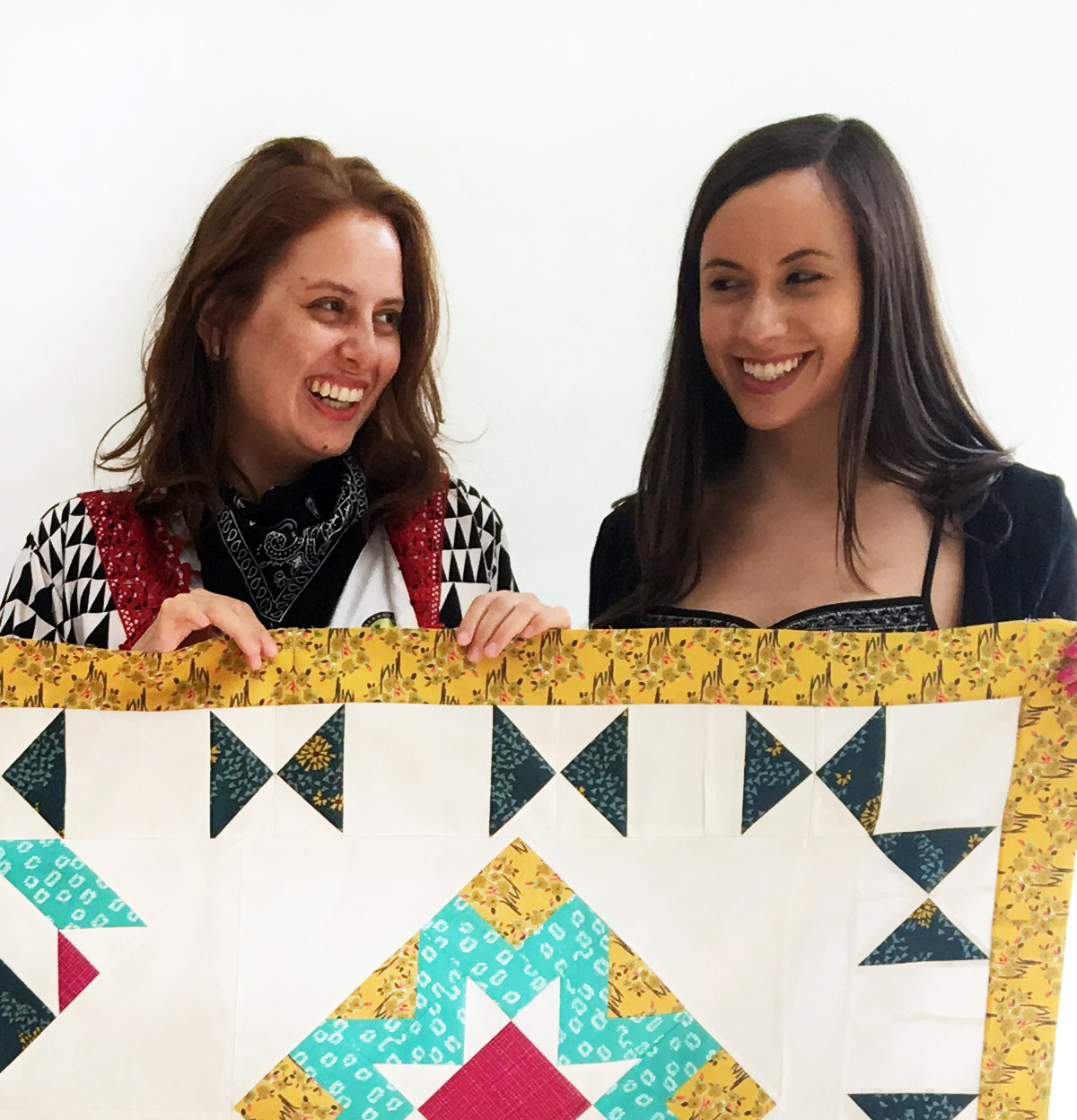 I am so excited to show you our finished quilt top for the Community Sampler hosted by two of our amazing fabric designers, Maureen Cracknell and Sharon Holland! The past fifteen weeks of this "Sew Along" has gone by so quickly but we enjoyed every minute of the process. This week, I teamed up with three awesome girls from the AGF Crew to attach the border section of our quilt! It was such a treat to teach the girls how to make flying geese using the no waste method! See our finished quilt top below and meet the wonderful ladies that finished up this beautiful sampler we created with Splendid Fusion
