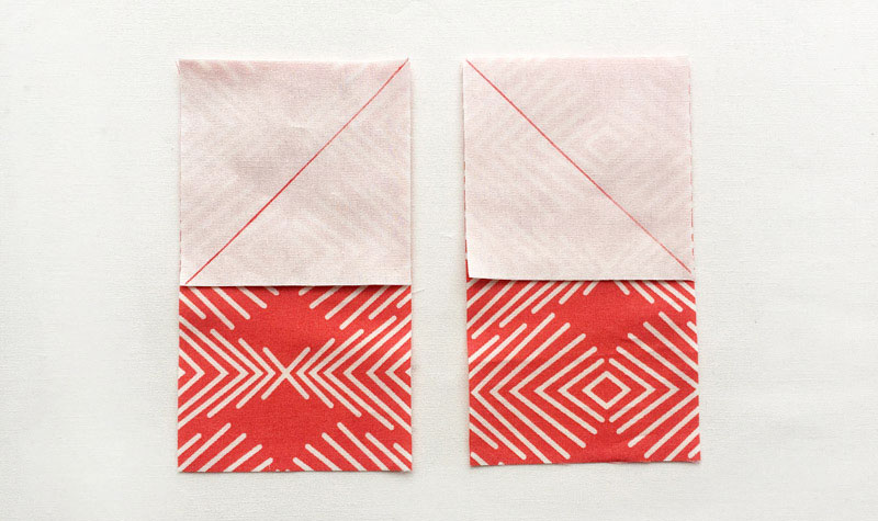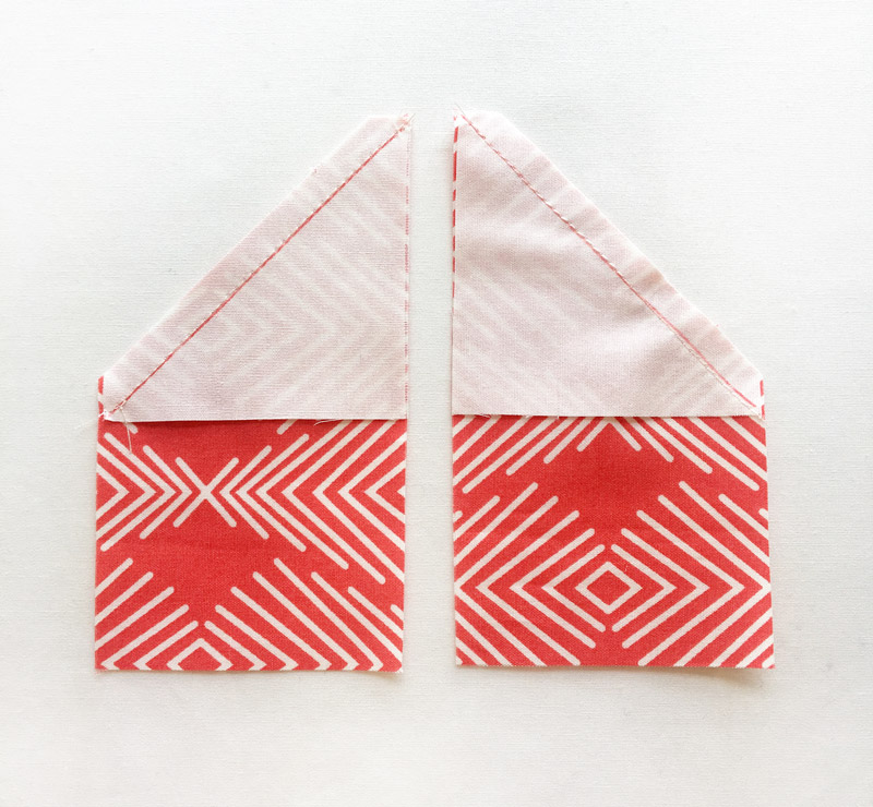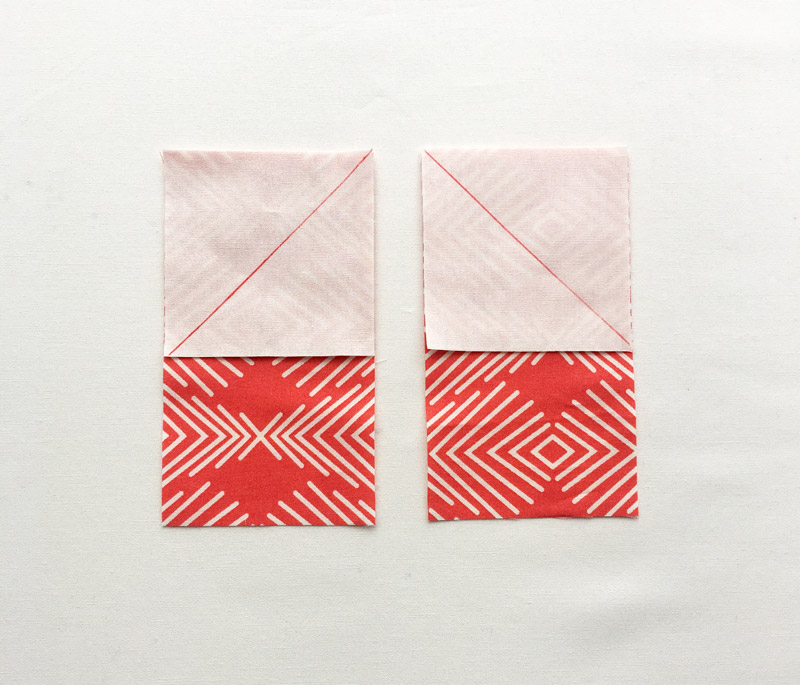 I love how this mini is to put together because its only one block unit repeated 16 times which creates this super fun zig zag pattern! To create a unit you will need two 2 ½” x 4 ½” strips from Fabric A and four 2 ½” squares from Fabric E. Draw a diagonal line with a fabric marking pen on the wrong side of all your 2 ½” squares. Place squares on the top of each 2 ½” x 4 ½” strip with the diagonal lines facing in.