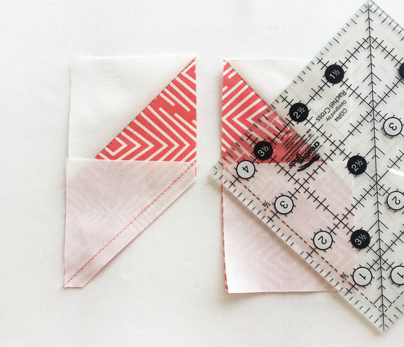Repeat this process with your remaining two squares with the diagonal lines facing in. Sew on the line you drew and trim seam allowance to ¼”. Press seams in alternating directions.