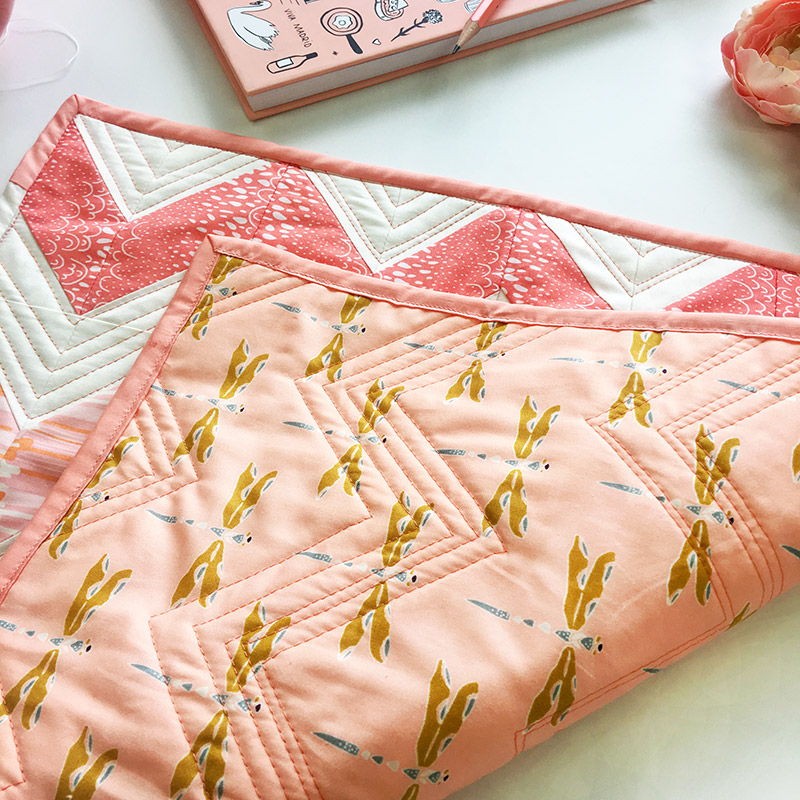 Now… for my favorite part choosing the thread and backing. I choose the "Nox Iridescence Aglow" print for my backing! The dragonflies in this print are so cute and have me thinking of picnics at the park watching them float around in zag zag patterns. I chose a really yummy orangey coral thread to match my fabrics and decided to do a little straight line echo stitching in the white areas of my mini! I varied the width of the lines and I love the final finished look!