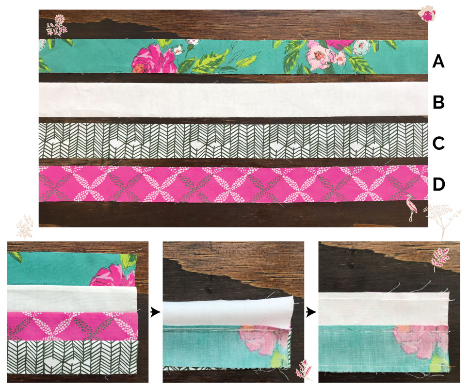 Who likes to save time while making beautiful things? If you do, today I will show you a way to get two different types of blocks from one strip set. It's really easy and saves you time while minimizing fabric waste! The fabrics I chose are from the blooming and hand-drawn styled Signature Collection and from the Pure Elements: Extempore Fancy (Fabric A), White Linen (Fabric B), Venture Caravan (Fabric C), and Sporangia Plaid Dotted (Fabric D).