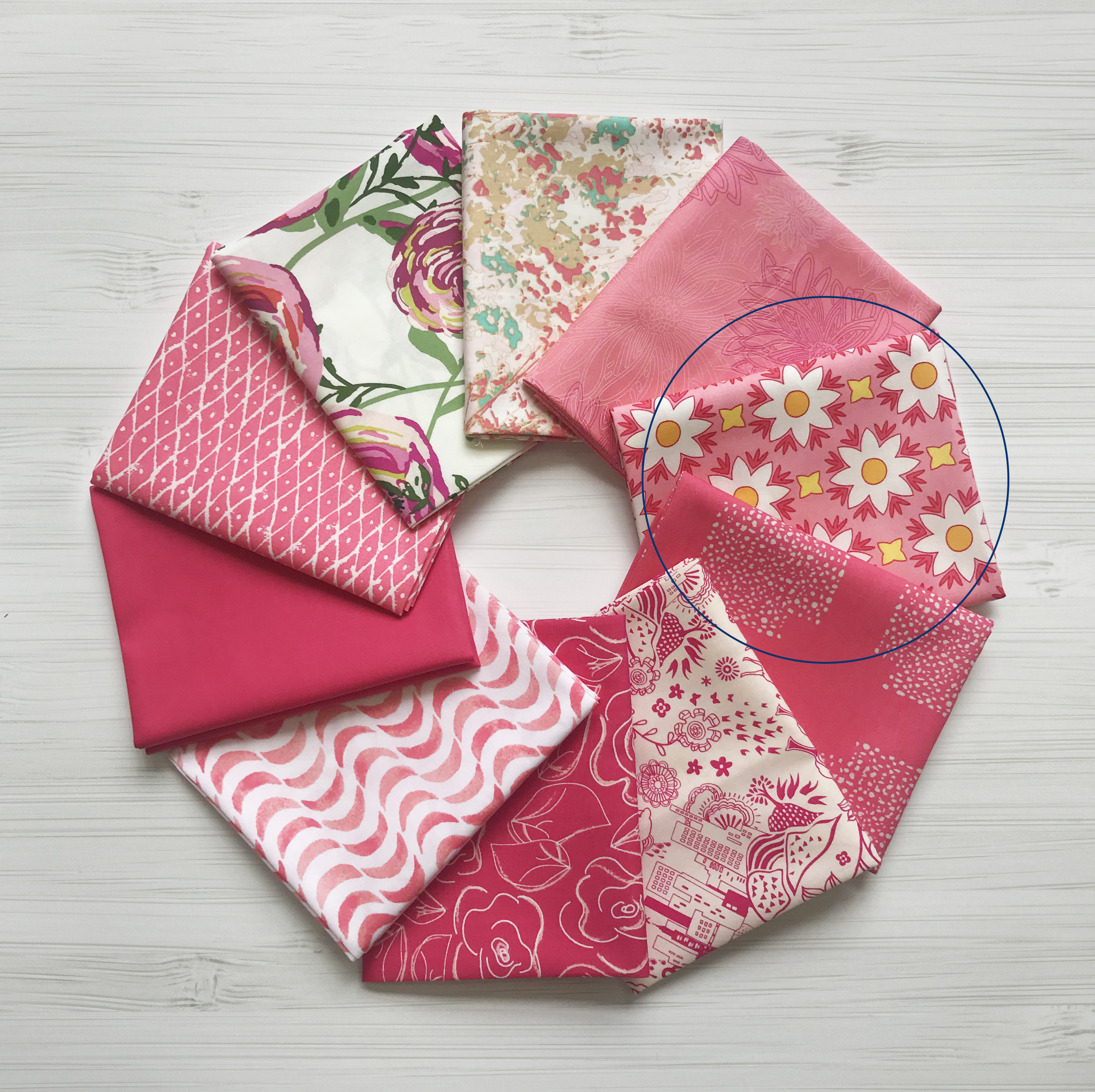 This “Color Master Box” can give you the option of using just one print or several to compliment any of your sewings designs. Although this bundle highlights the color pink, each print has distinct color palettes that make it easy to pair with other projects. For example, the print called “Quite Lovely Sugar” (Print shown below, circled in blue) has white, bright yellows, and a dark pink that can help piece together other fabrics with a matching color palette.