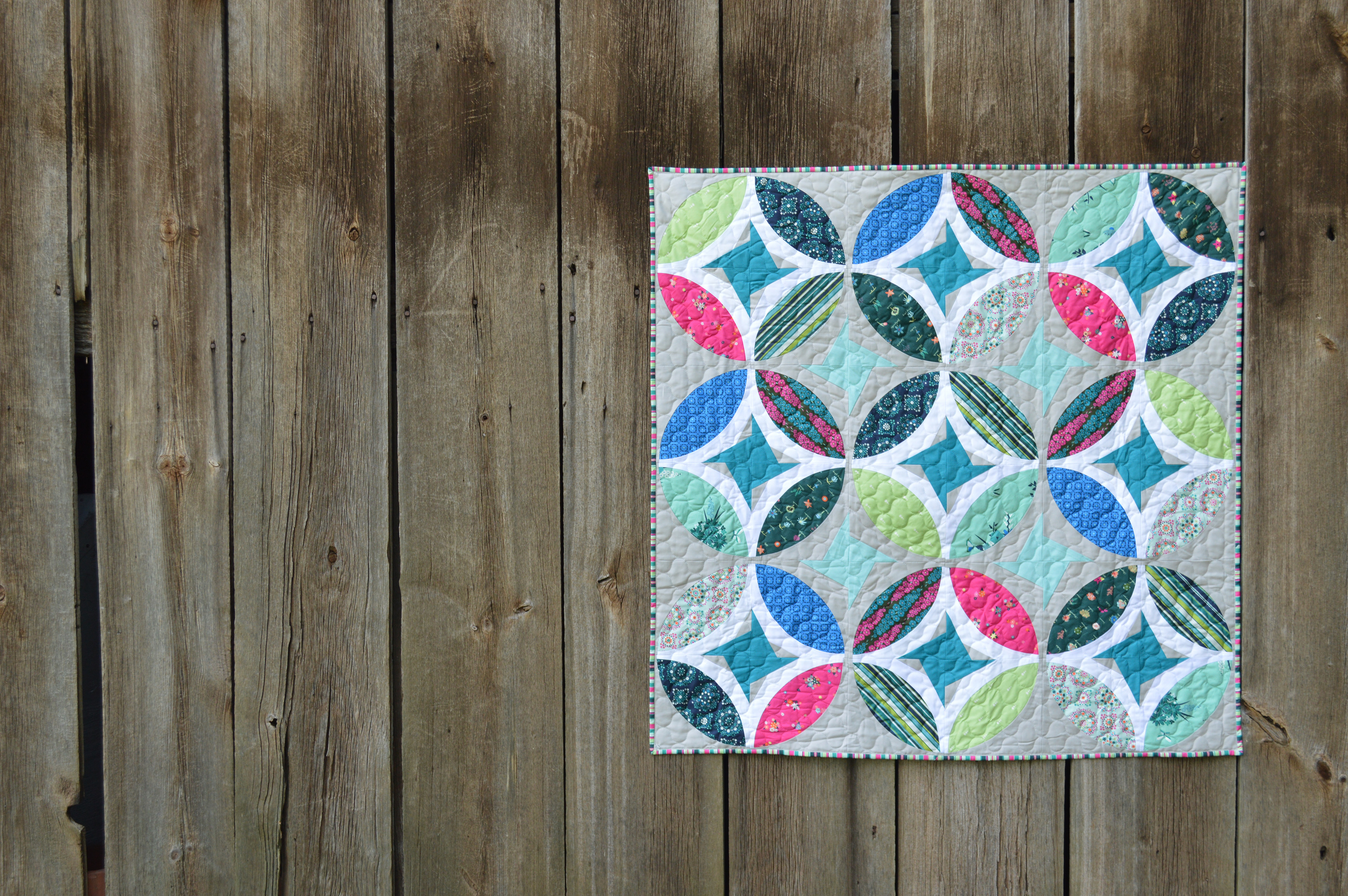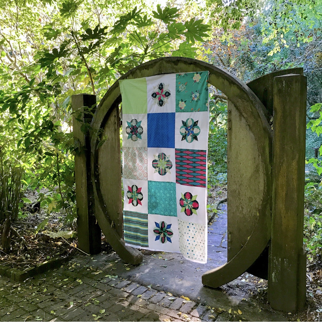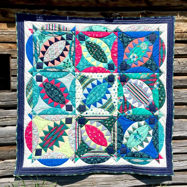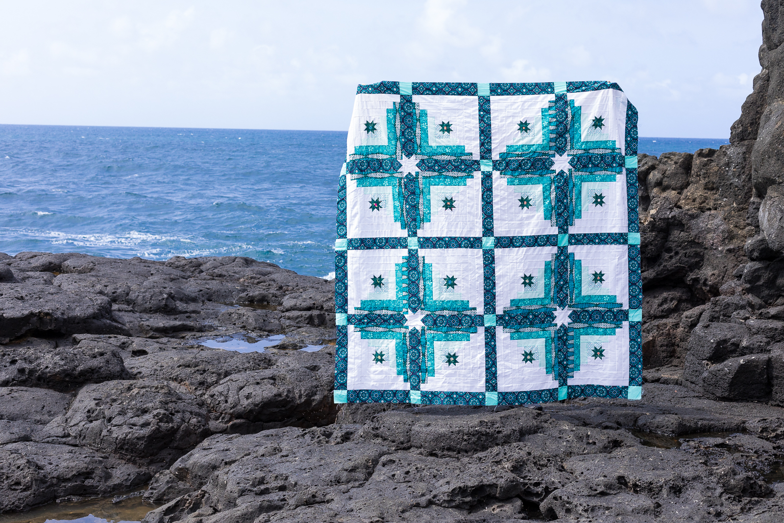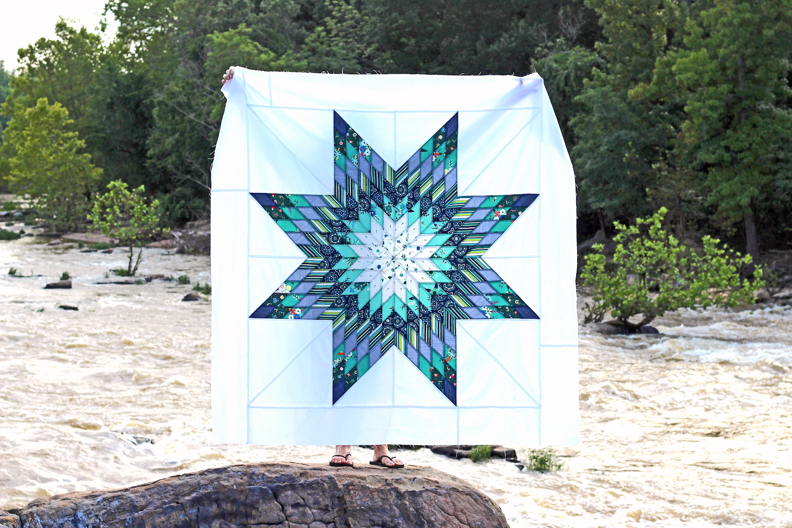 Kim has created such a stunning Lone Star Quilt with the blue, green and white prints from Loved to Pieces fabrics. Placement of fabrics are key to creating a successful Lone Star Quilt and I can definitely say Kim did a phenomenal job! Head over to her post to hear about her quilt photography adventure! :)
