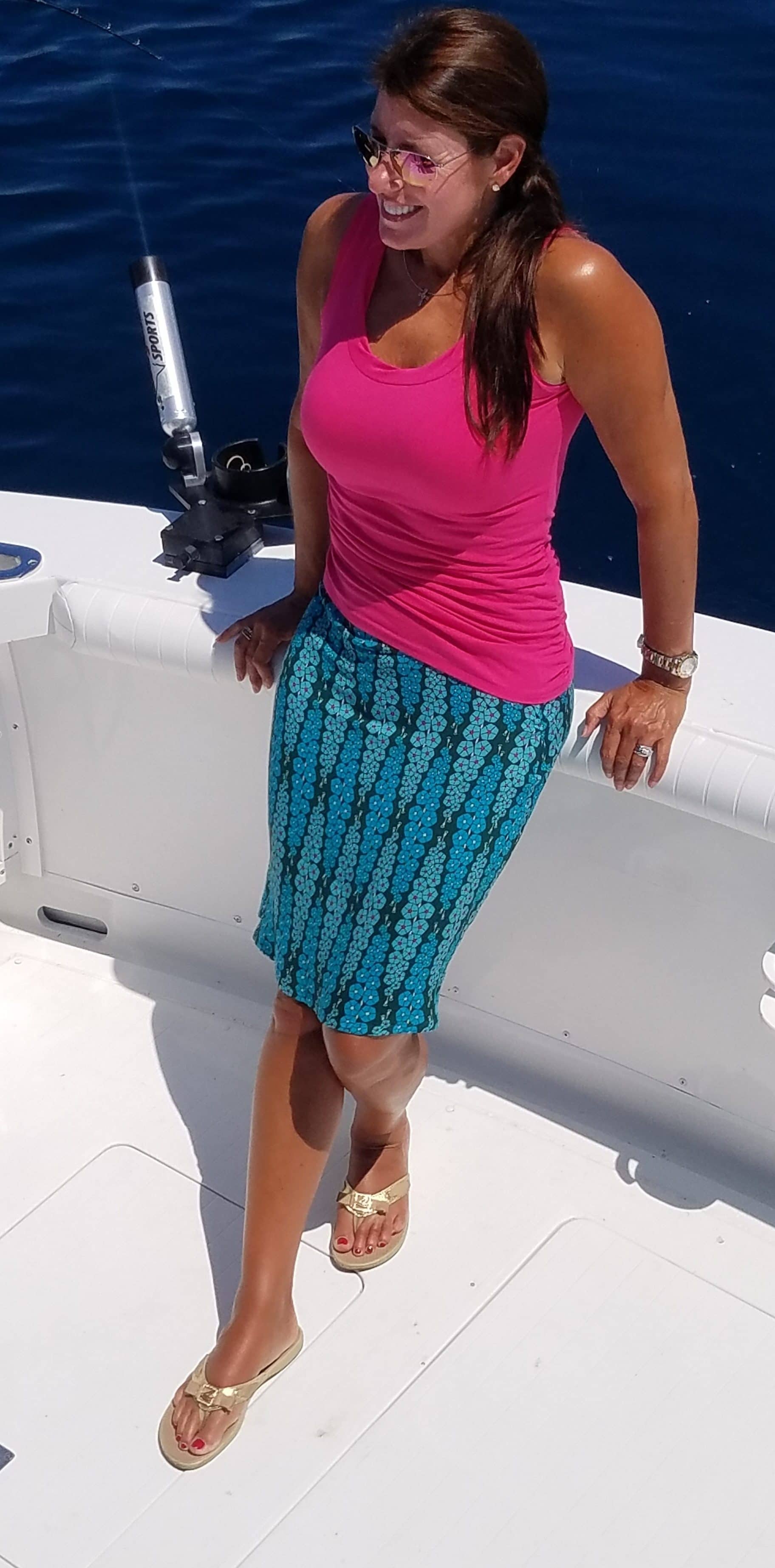Angela Wolf may have just created the perfect summer outfit! Using the “Gladiolumns DeepBluem” rayon print from Loved to Pieces Fabrics she sewed up the Kate Skirt Pattern with a cute basic tank made with AGF Solid Knit to go with. This tank and skirt combo is so flattering and a great addition to your wardrobe in the last few hot weeks of summer!