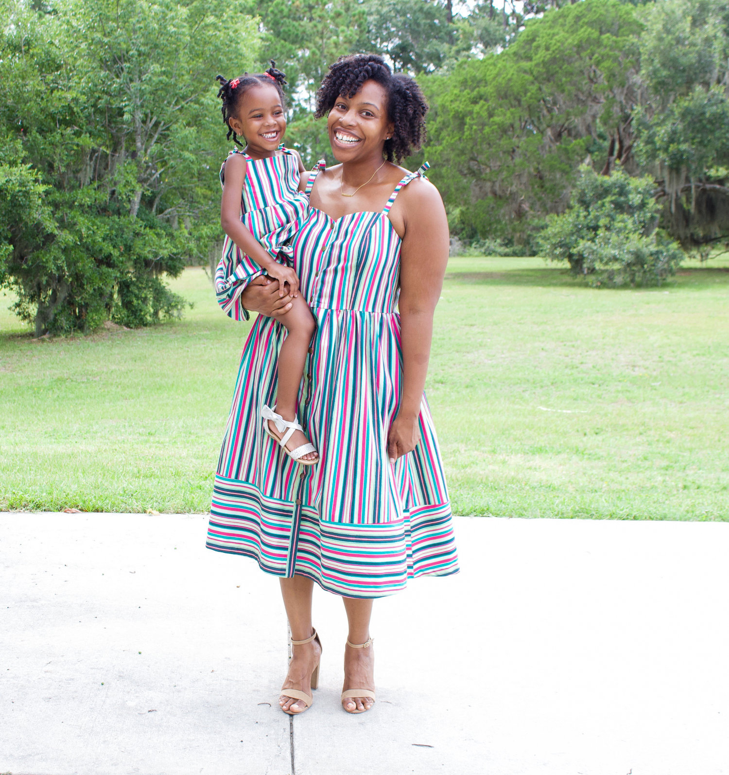 How cute are these two!? Brittany Jones used the “Striped Flow Rainbow” print and sewed up the cutest dresses for her and her little one! I looooove the extra details she added to her dress with the crossgrain stripes at the bottom, the great snap embellishments and the tie straps creates a nice delicate touch!