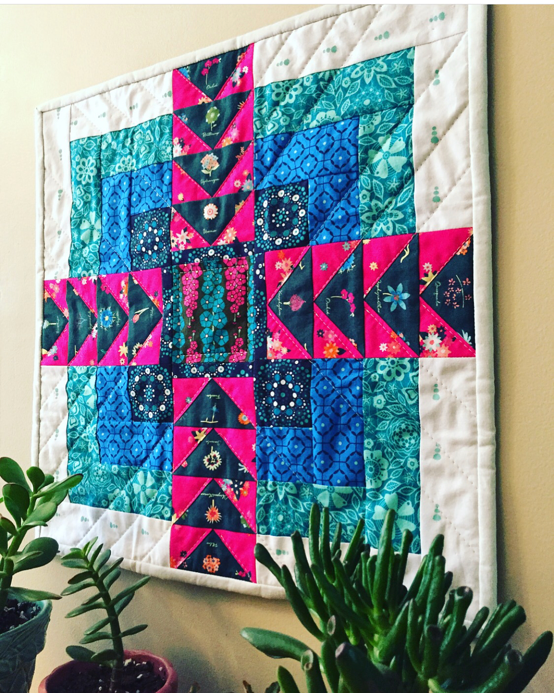 If your a flying geese fan like me there is no doubt you aren’t going to fall in love with Kate’s Luminescent Quilt! She had a blast fussing cutting the florals from the “ Anthomen Festive” print and I love how this fabric pops when being surrounded by the bright pinks of the “Efflorescent Fuchsia” print.