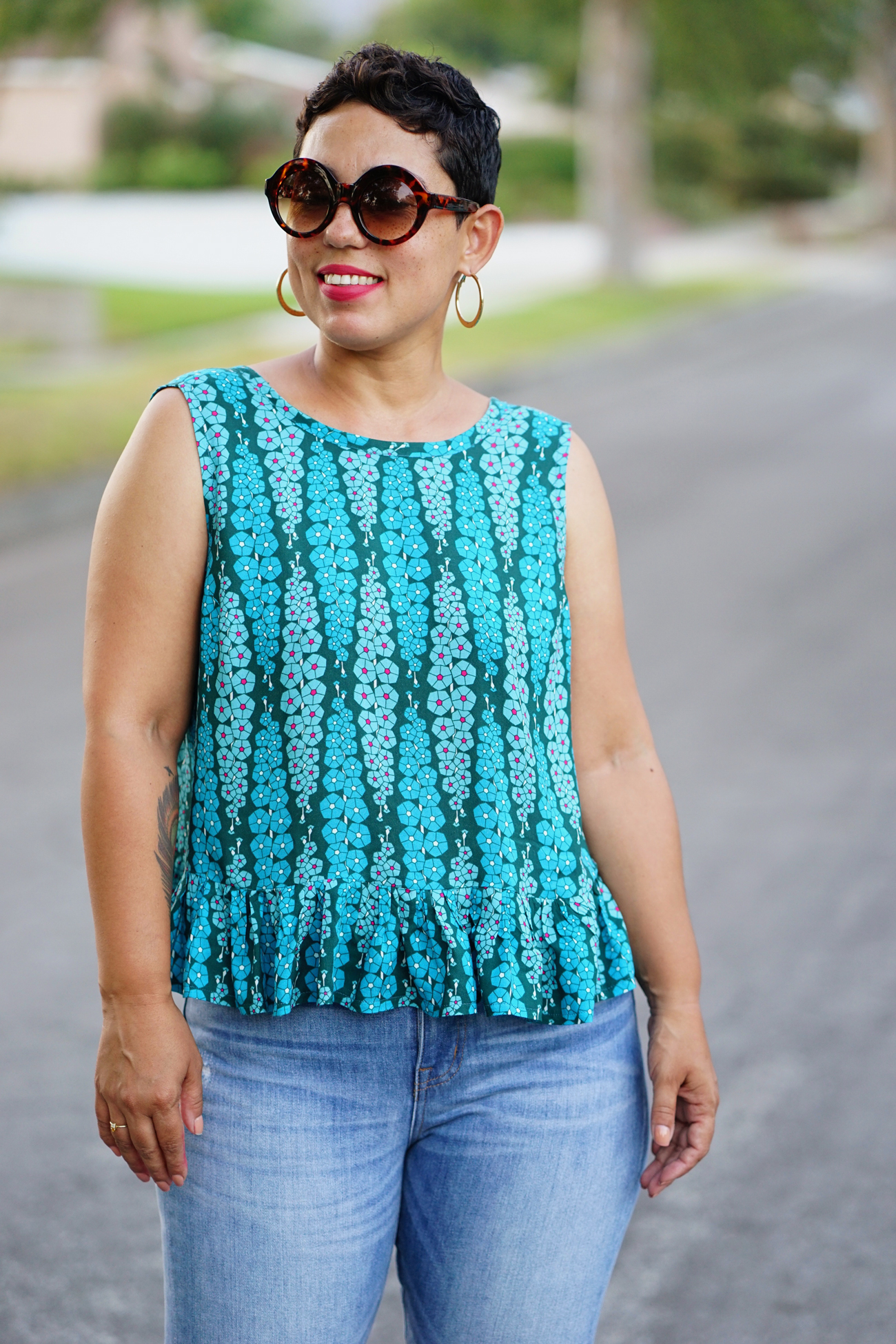 This tank is truly a must make and has been added to my to sew list! The open back is pretty cute, I could also see making a bunch of spaghetti straps and filling in the open space with a strappy look! AGF has a great assortment of Rayon Solids and prints but the “Gladiolumns Deepbluem” rayon print has quickly become one of my all time faves and looks gorgeous made up in this tank!