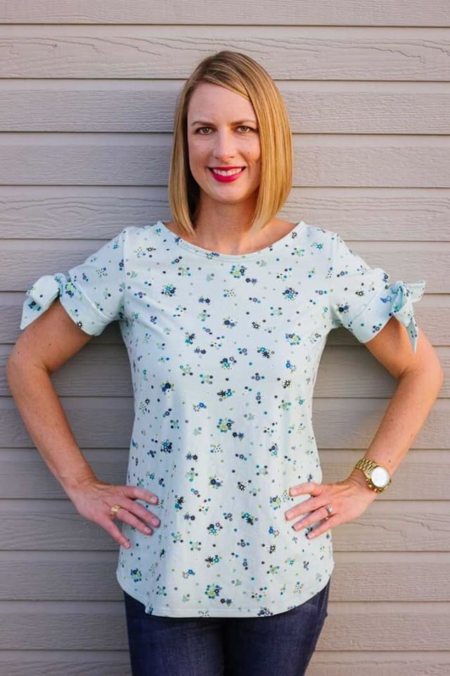Courtney Davis made the Shoreline Boat Neck pattern with a cute little twist! The bows she added to the ends of the sleeves are so adorable and creates a fun, feminine touch. She sewed up this great top in the “Efflorescent Celeste” knit fabric which is just the prettiest shade of pale blue.