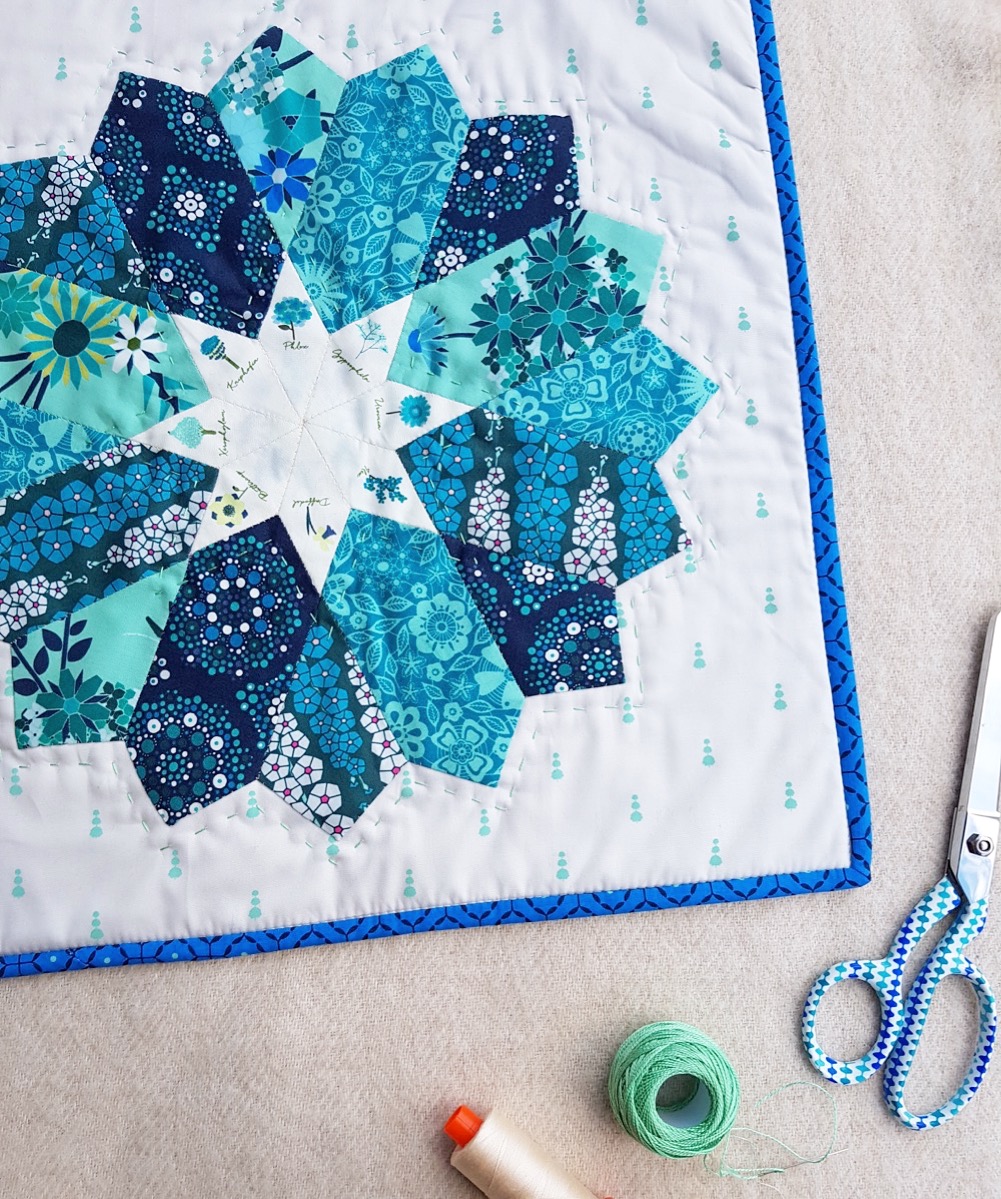 Jodi from Tales of Cloth is a EPP master in my book! I always get excited to see what new projects she sews up next! She created this cute mini showcasing the lovely blue prints from Loved to Pieces Fabric and fussy cutting the sweet flowers from “Anthomen Serene” for the center! It’s safe to say everyone is enjoying the fussy cutting possibilities of this print!
