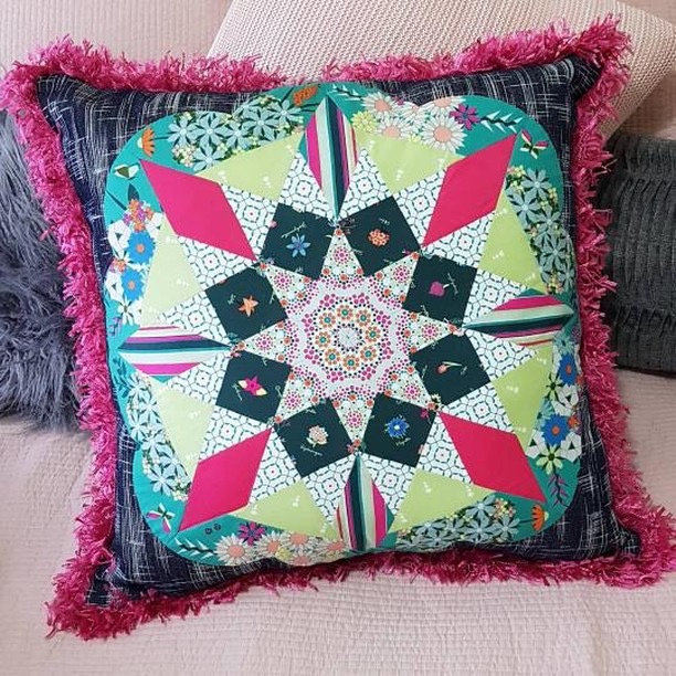 Sharon Burgess made the most festive pillow by sewing up a EPP block from her Flourish Quilt pattern. I could totally see my 11 year old niece loving this vibrant pillow! She also made a cutest boxy pouch with pom poms so make sure to head to her blog to check it out!