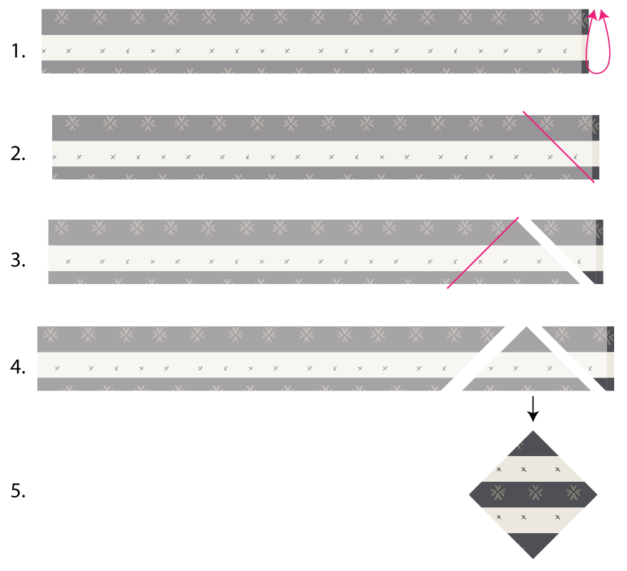The only requirement is that all the strips measure the same. In the following diagram, you can see that I got four blocks from 2 1/2" strips. However, if you choose to cut smaller strips, you will get more blocks per strip set, and if you choose to cut bigger strips, you will get less blocks per strip set.