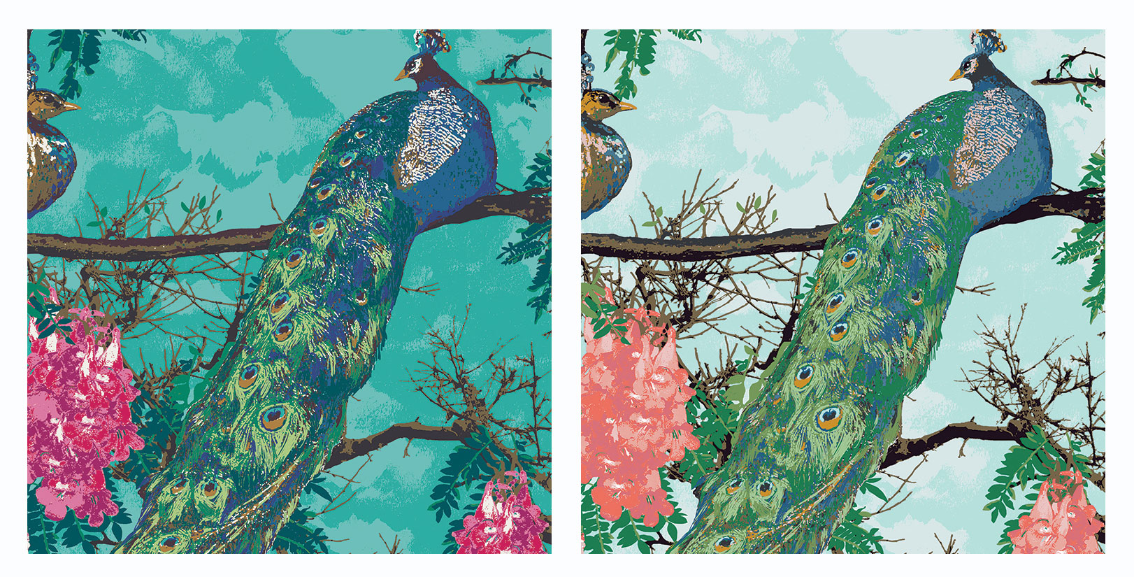 There are lot of dark colors mixed with pops of hot pink and teals which create the most striking color palette to work with. It’s always hard  for me to choose only one favorite print from our designers fabric collections but one that stands out the most to me is the “Florid Peacocks Demure” and “Florid Peacocks Lush”!