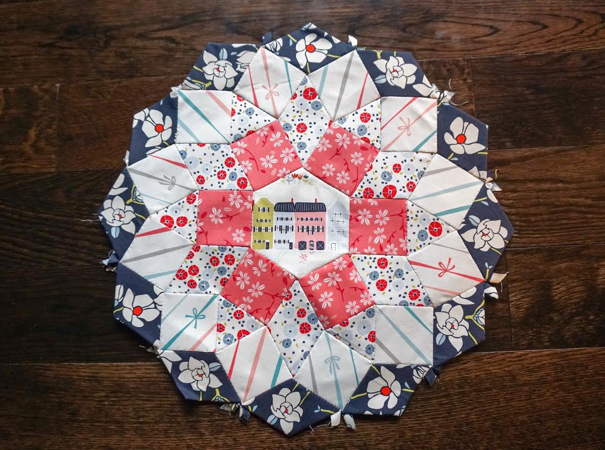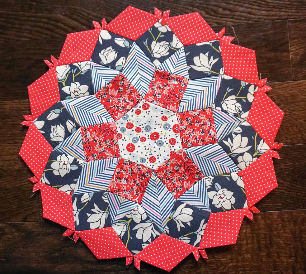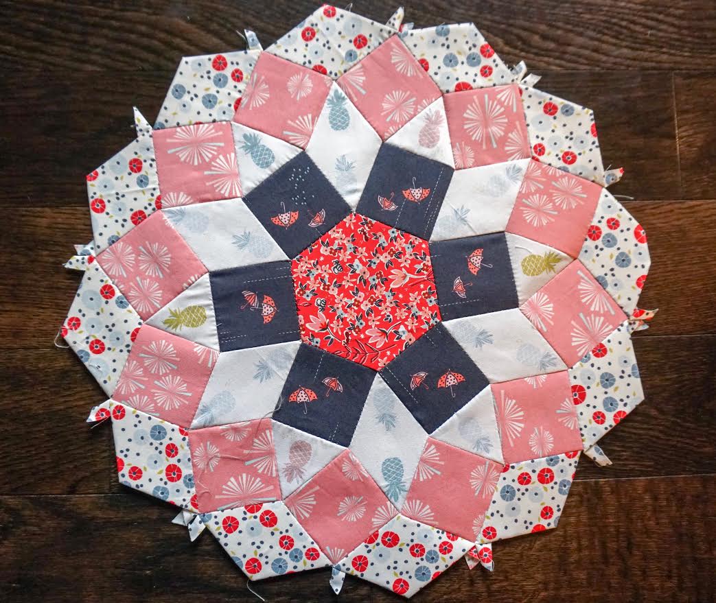 Getting some precut EPP papers on a magazine two years ago made me decide to try it again. This time the hexie flowers went together perfectly. In the Spring of 2017, I took part in the Girt By Sea quilt along.  The central medallion was English Paper Pieced using Tales of Cloth’s precut papers. It was just the best sewing! I ordered another EPP kit as a retirement gift to myself and the first Mandolin block was included as a bonus.  I loved making it as well as the next 17 blocks! Now I have so many EPP plans for the future.
