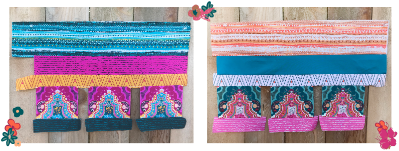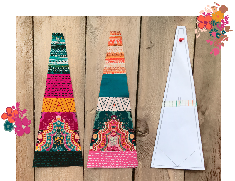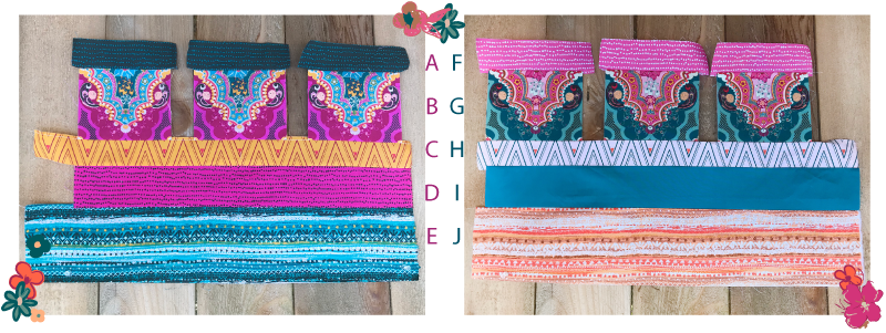 Start by designing two strip sets in the same size with contrasting colors. In this case, I cut rectangles from fabrics AB and FG to center their print with the small triangles from fabrics C and H. Just to get a more balanced effect once all the pieces are joined … and also because I'm a fanatic of print alignment :).
