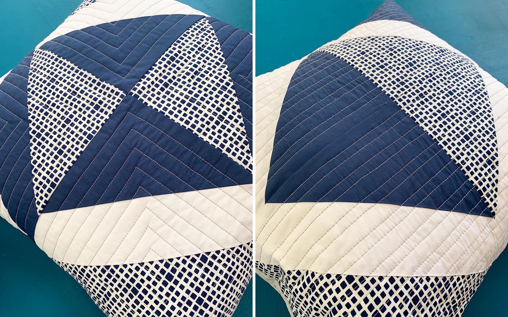 With the leftover HST pieces, I made a second pillow and played with the design to make a totally different look. I even gained some confidence and I quilted the second one with a square motif in mind. I learned a new sewing technique when I arrived at the end of quilting my swirl, where I would raise the needle, grab the thread and transfer it to the other side and tie it off with the bottom thread.