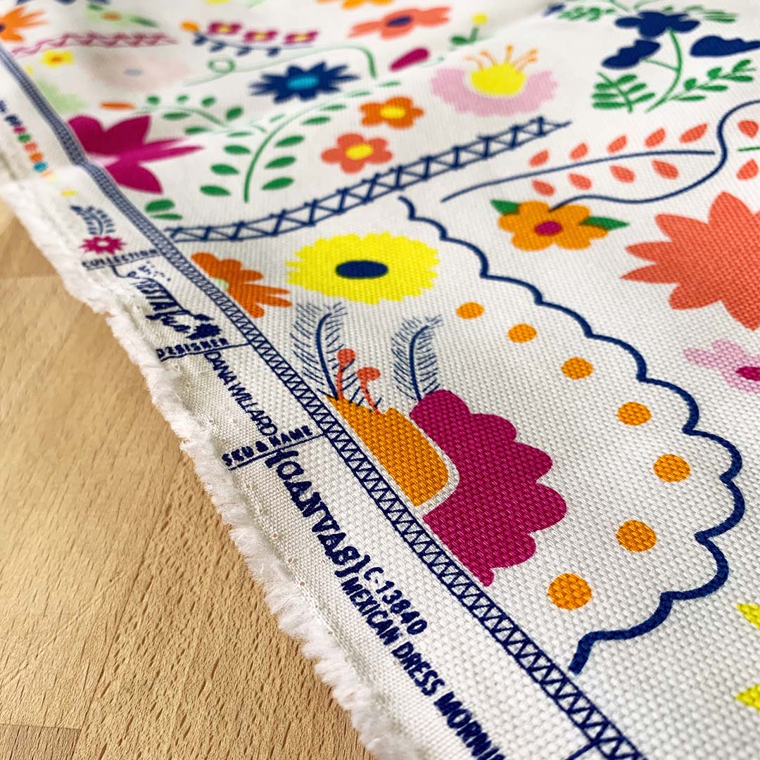 Today I’m excited to have started a new chapter in my sewing journey, and it was to use another substrate I wasn’t familiar with. I really wanted to learn more about our canvas substrate, so what better to make a project with it? First thing, I thought of sewing was a tote because I wouldn’t be afraid of cutting a lot of pieces, and it could also be simple enough for any beginner to make! I started this project on the first day of summer so I was inspired by the summery canvas print “Mexican Morning Dress” by Dana Willard to make the perfect tote for a beach day, or a trip to the farmer’s market.