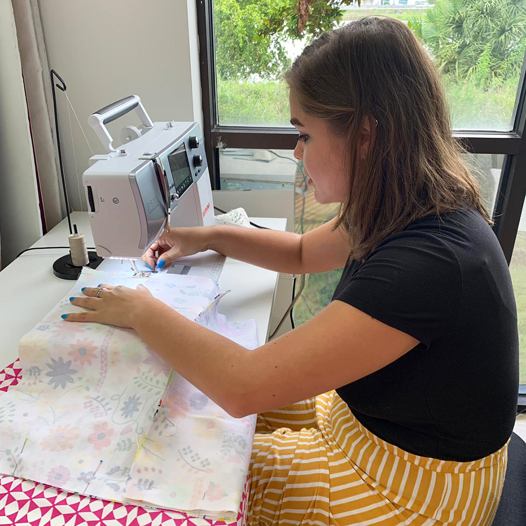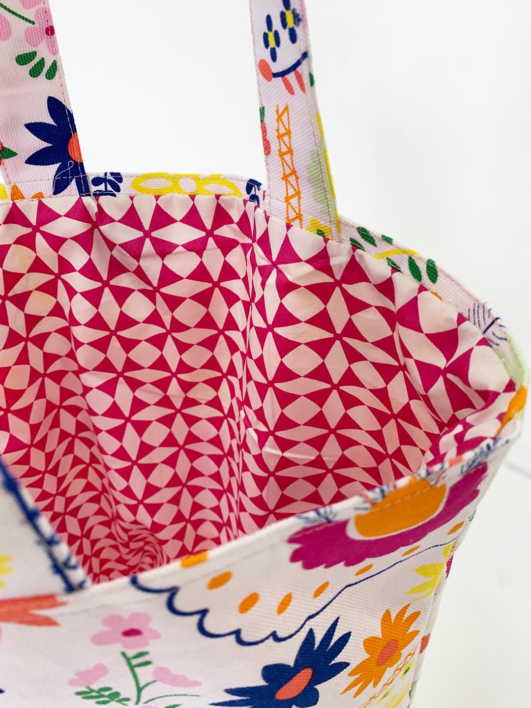 Oh, snap! Check me out, sewing away! With my sewing wizard, “Meli” by my side, she guided me through the entire process. A fun thing about this tote bag is that it’s totally customizable. I wanted to make it rectangular shaped, so it could be long enough to fit a rolled-up towel or some fresh baguettes! I cut out 16’’ by 21’’ rectangles and repeated that cut on the inner lining which I decided to use a cotton print by Dana called “Windmill Magenta” from her Blush collection.