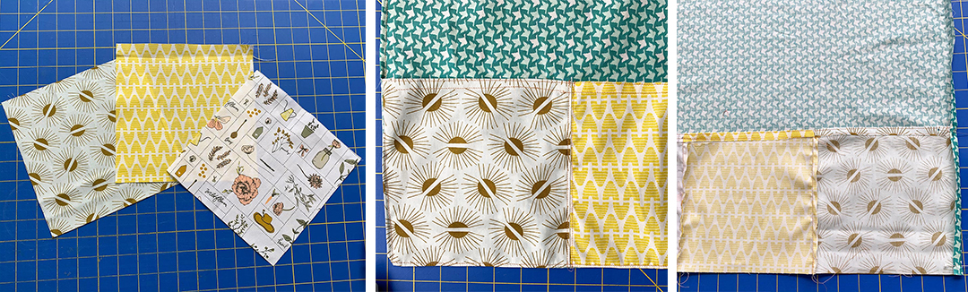 -Three 7 ½ inch squares for the pockets (I used prints “Spiny Oasis Divine,” “Beekeeper Lime,” and “Simple Living.”)