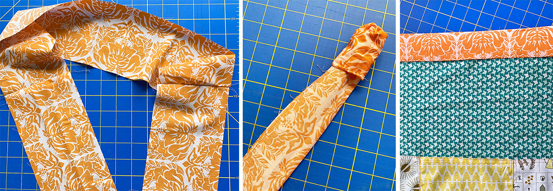 Lastly, I grabbed the three strips and sewn them together so I can make one strip, big enough to tie behind your back. I folded the strips in half, pressed the right sides together, and sewn on the edge. Flip the tube inside out and sew the ends. Iron to make completely flat, and align the edge with “Feathered Flight Sunken” then sew together.