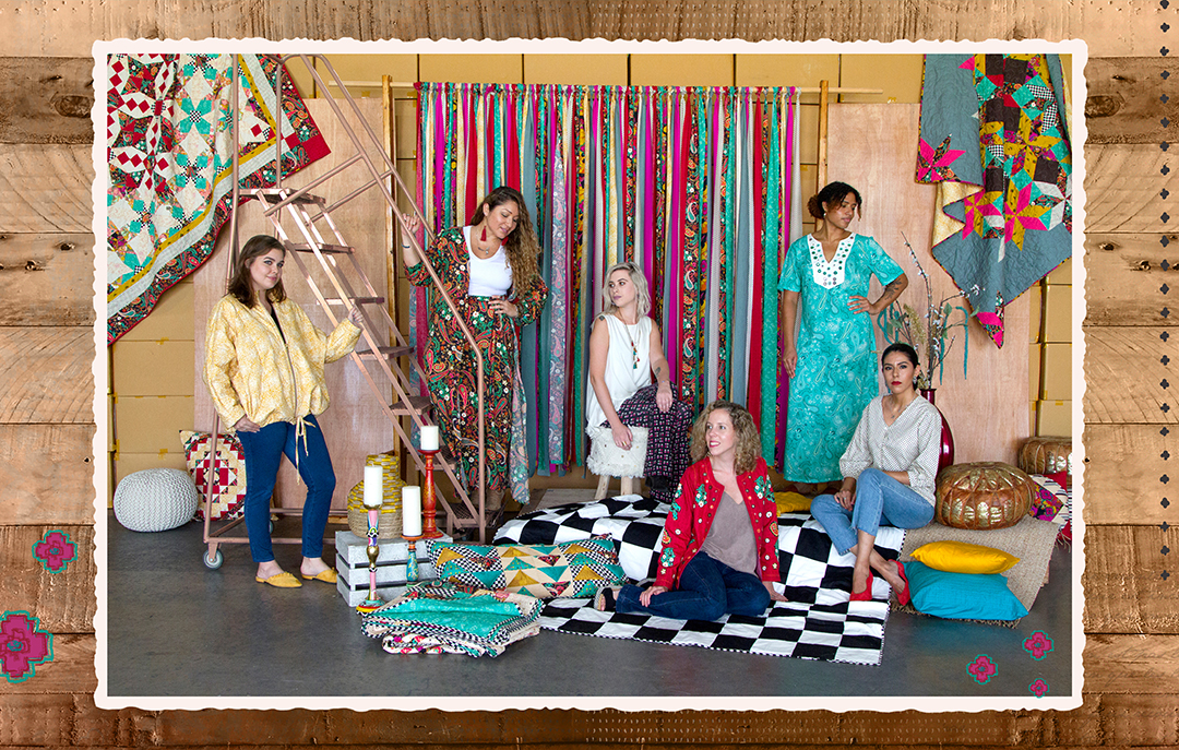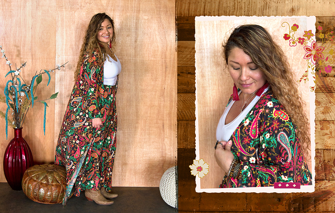 With all of this in mind guiding us for visual references, we also knew we wanted to create boho jackets, blouses, pants, and dresses which make perfect, transeasonal pieces…especially with fall right around the corner! Deciding to do something different and fun for a change, we had some of our own AGF ladies at home office pick their favorite print from this collection and pair it with a pattern of their choice.