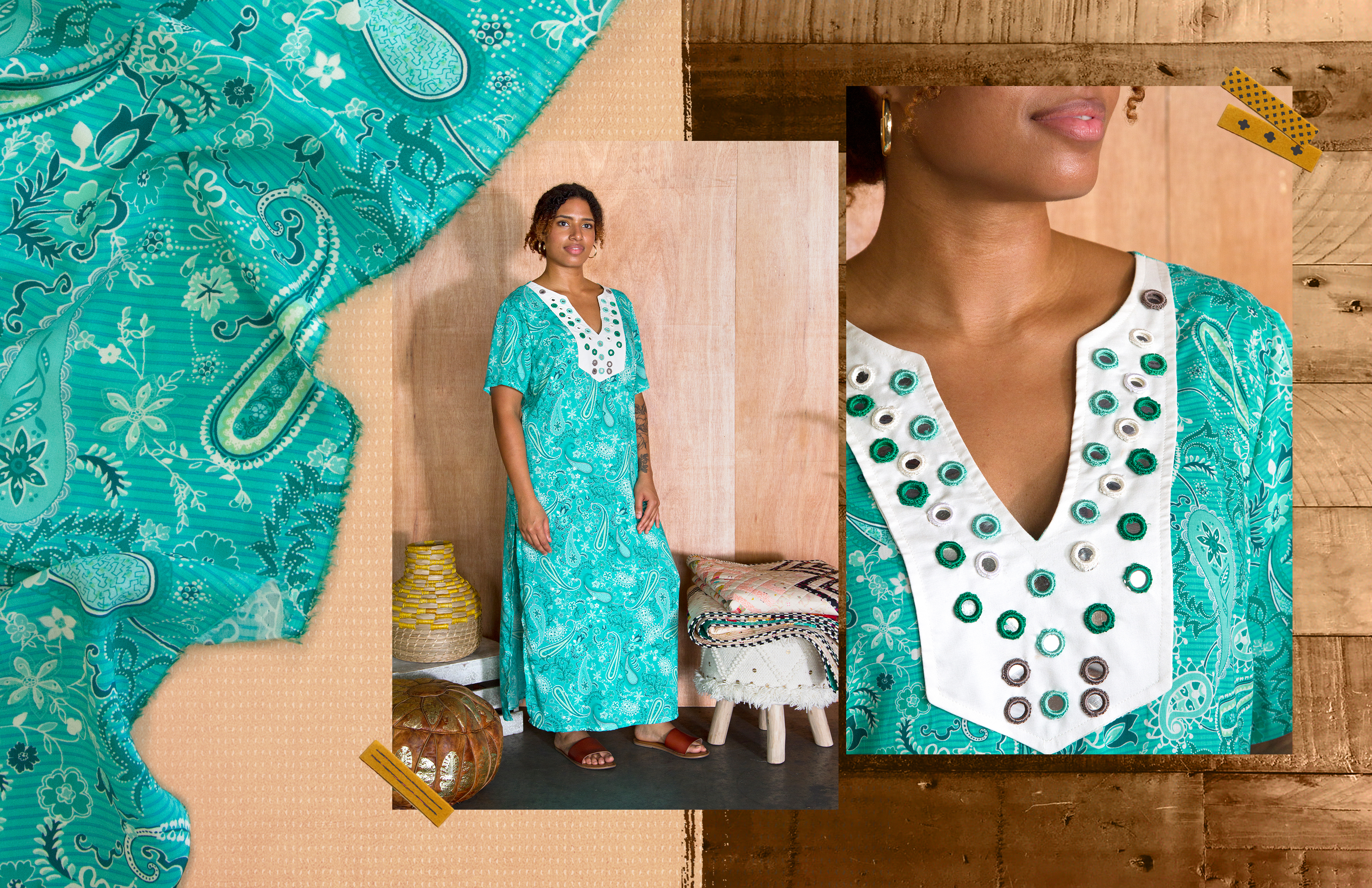 Noemely // Graphic Design "I have to say, the pattern was my first love in this beautiful creation. I knew that for this dress, rayon was a MUST and I am a sucker for long, flowy dresses. The “Paisleys Forever Turquoise” print in rayon caught my attention and immediately I knew that this intricate, floral paisley print would give this pattern the life it deserves. As you can see this dress is elegant enough for a romantic evening dinner but still comfortable enough to run errands on a Saturday."