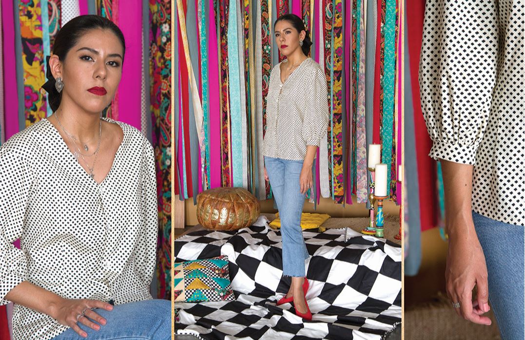 “I loved the simplicity and classic look of the “Goodness Thoughts” print and picked a pattern that complimented the voluminous sleeves of this blouse, and a touch of red never fails! Cotton was the best choice for this puff-sleeve effect.”