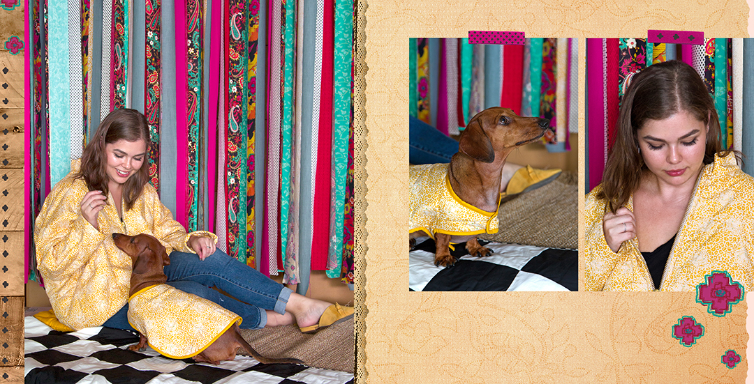 "The reason why I choose the ‘Pretty Eyes Twinkly’ print was that it reminded me of the inner, fierce attitude I have! From afar it’s a gorgeous, yellow print but up-close you’ll see those bold cheetah eyes. This oversized jacket was perfect for the cotton substrate because of the quilty stitching details. To match my sass, we brought “Phoebe” the wiener dog, to rock this look too!"