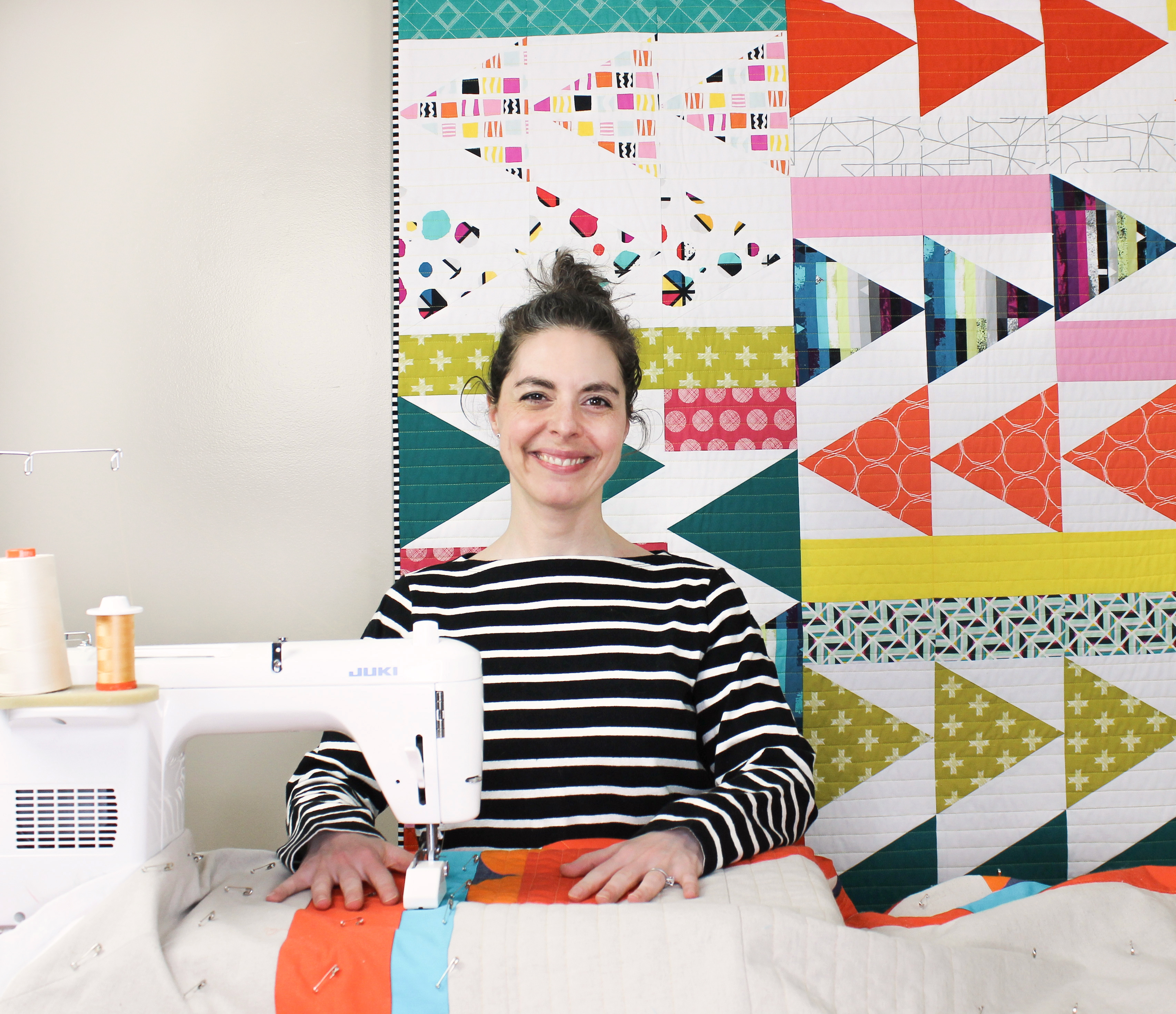 Hi! I’m Shannon. I’m the modern quilt pattern designer and maker behind Shannon Fraser Designs. I’m based out of Montreal, Canada and you can usually find me stitching away in my home studio with my hair in a top knot, sipping copious amounts of coffee all while hanging out with my loyal sewing companion – Pips – my cat!