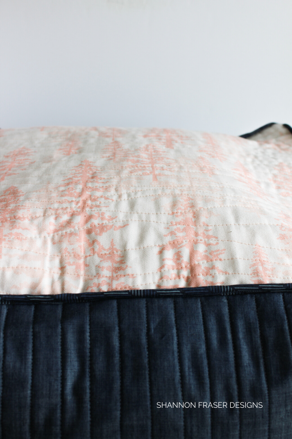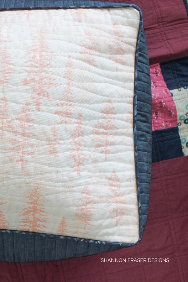 For the sides of the cushion, I decided to go with the AGF Denim in Indigo Shadow. I love how it pops against the soft cream and pinky/ peachy tones of the canvas. I wanted the focus to be on the tree print, but I wanted to add some additional texture through simple 1” straight line quilting. It adds a little dimension without being too bold. Plus, running your hands along it feels ah-mazing! AGF’s denim is the same weight as their PURE Solids, so you’re not dealing with the typical density of traditional denim. This means their denim has that silky softness you’ve come to expect from their quilting cotton. It really does feel divine.