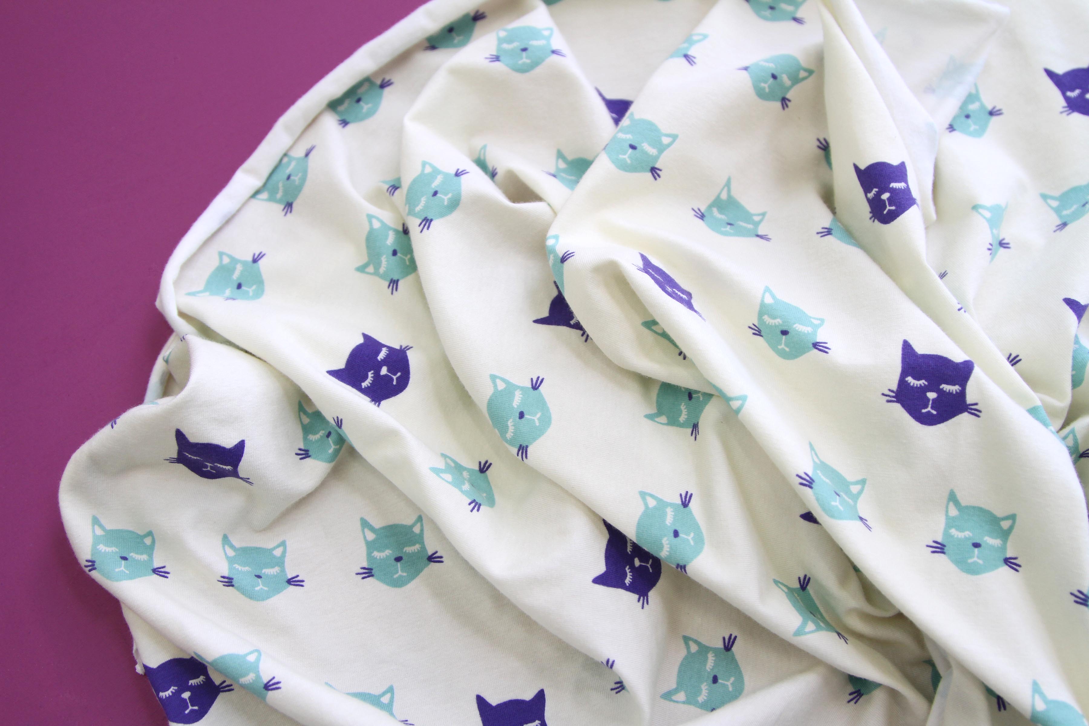 Oh Meow! comes in twelve cotton prints, one rayon, and one knit print. Jessica mentioned "If this collection was a person, it would be a rambunctious, kitten-obsessed 6-year-old girl! , which I totally agree with. I can see some of these prints be used in apparel for young girls such as dresses. Our one rayon print is a blender polka dot print perfect for some flowy trousers just as the one made for the lookbook. If you love our cotton print in "Cat Nap", you'll definitely be a fan of our only knit print "Cat Nap Blu" which is a colorway. The creamy white color and blue-toned kitty faces add an extra touch of coziness to the texture of knits. For more feline playfulness and inspiration on what to create with this collection and free patterns, view our latest lookbook below!