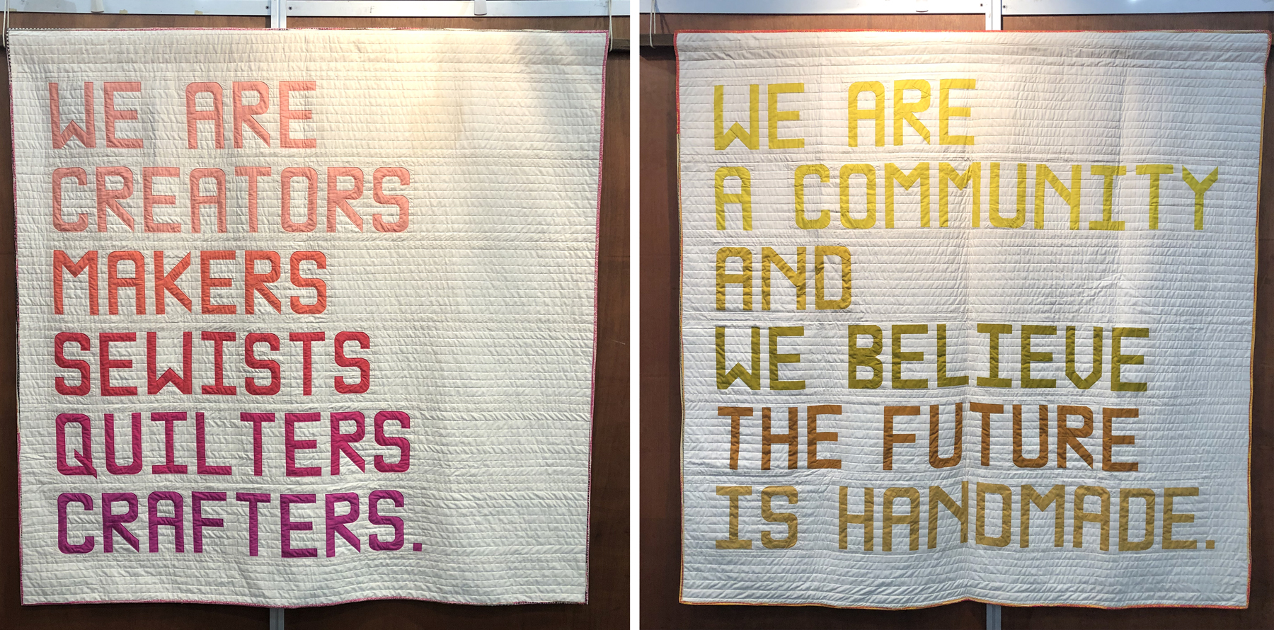 Both Makers’ Manifesto quilts were made with Art Gallery Pure Solids. I pieced and quilted one of the quilts with a beautiful ombre of coral to magenta colors. Special thanks to Jenny Meeker for piecing the “We are a Community” quilt in the beautiful yellow and mustard palette.