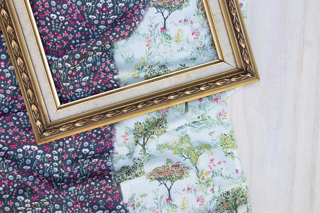 Picturesque comes in several large-scale prints that complete the story like “Rosemantic Trellis” that would be stunning as the backing of quilts, or decorative pillows. Embrace all the patchwork projects you can make by balancing all the large-scale prints with some blenders of the collection like “Bound Treasure”- small prints that create texture and contrast.