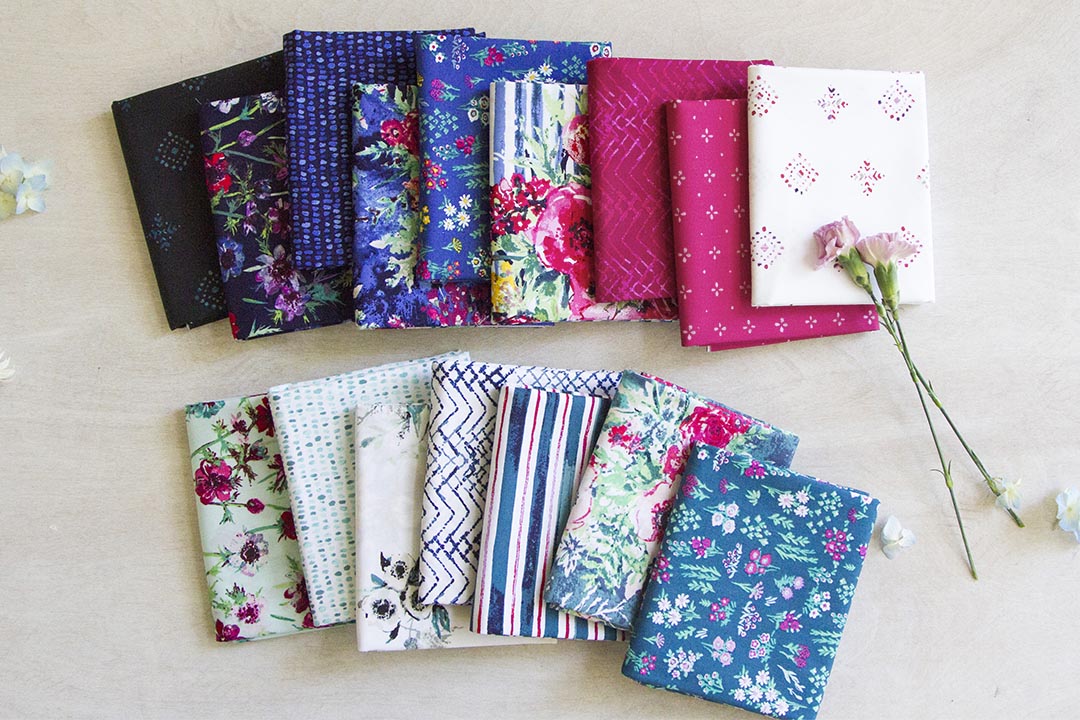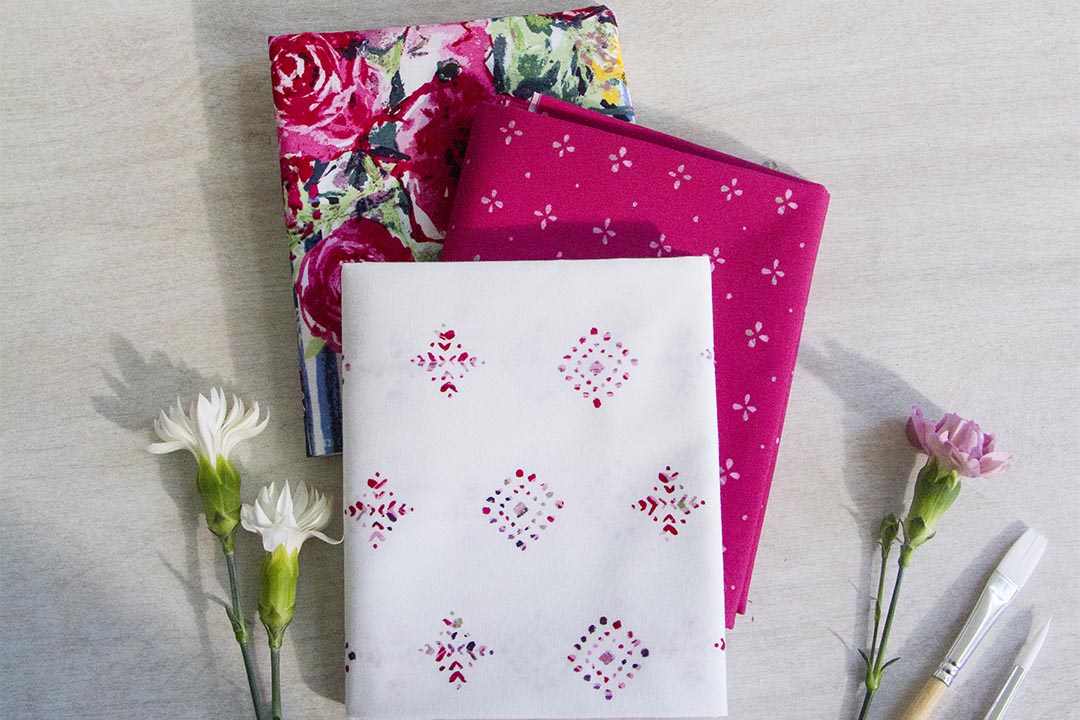 You have everything you need in this collection, lights, darks, large florals, small florals, and unique blenders. I can already see the intricate quilts under the hashtag #AGFAquarelle!  The magic trio pictured above shows a perfect example of the variety of prints offered, like “Rhomastic Positive” that you can fussy cut without disturbing the rest of the elements, “Watermarks Cerise” which is small enough to use as a blender and that looks great when sewn with larger prints like “Plein Air Bouquet.”