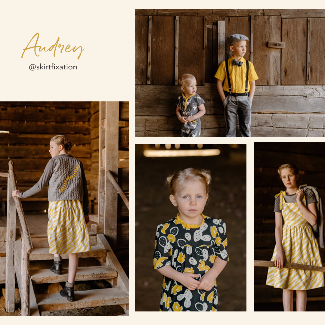 knits and it’s paired with Morocco Pants using “Cluded Horizon” denim. - This sweet girl also models a (modified) D'Anjou Dress made up in a patchwork of yellow and grey Art Gallery Fabrics premium cottons.