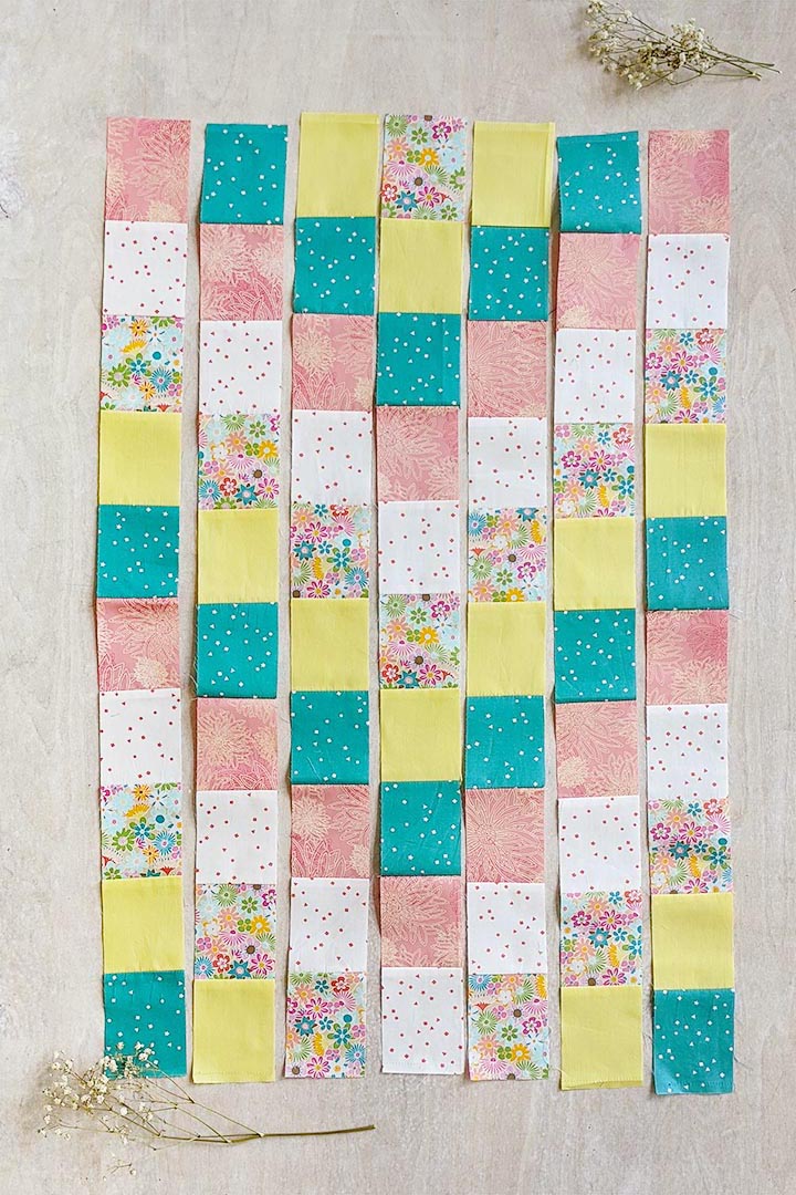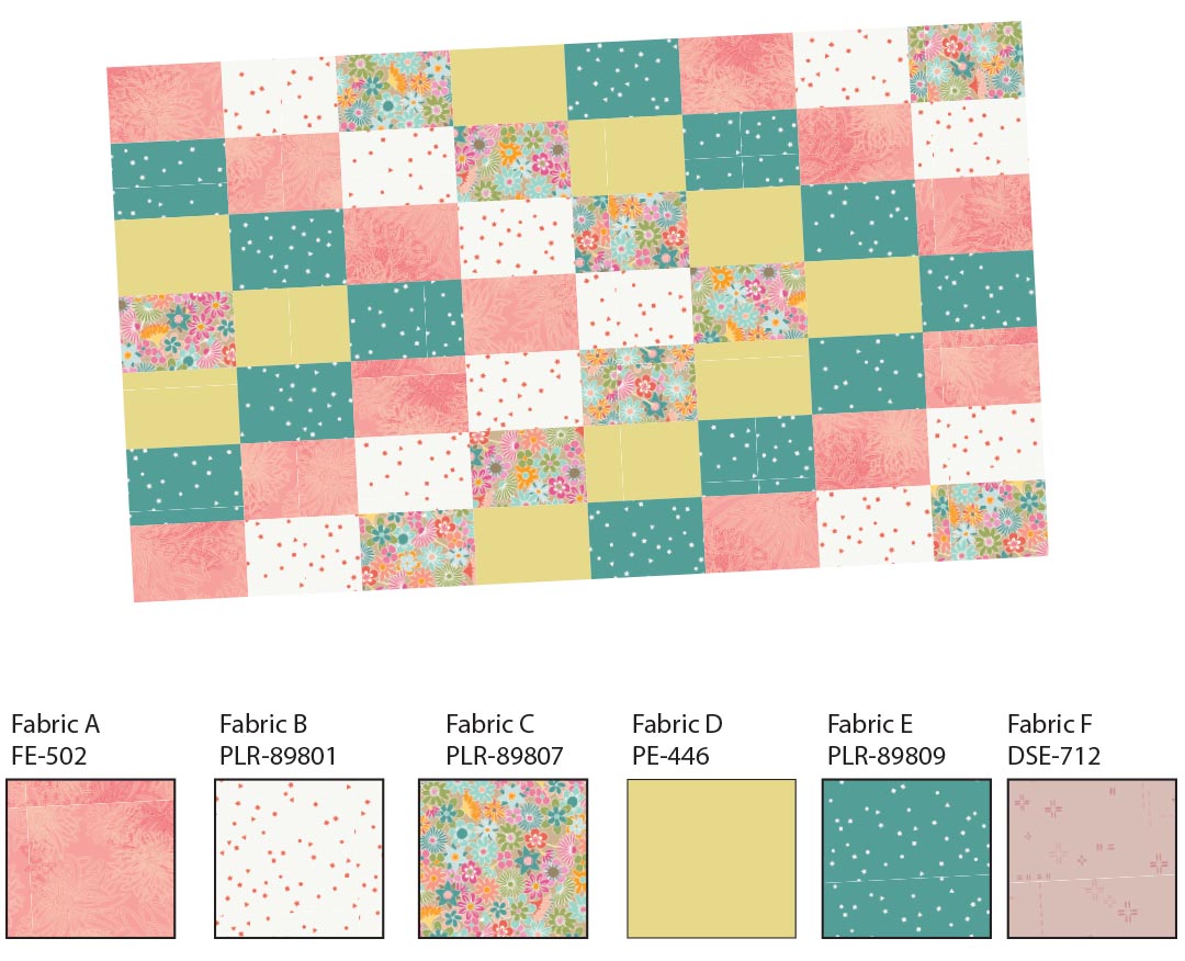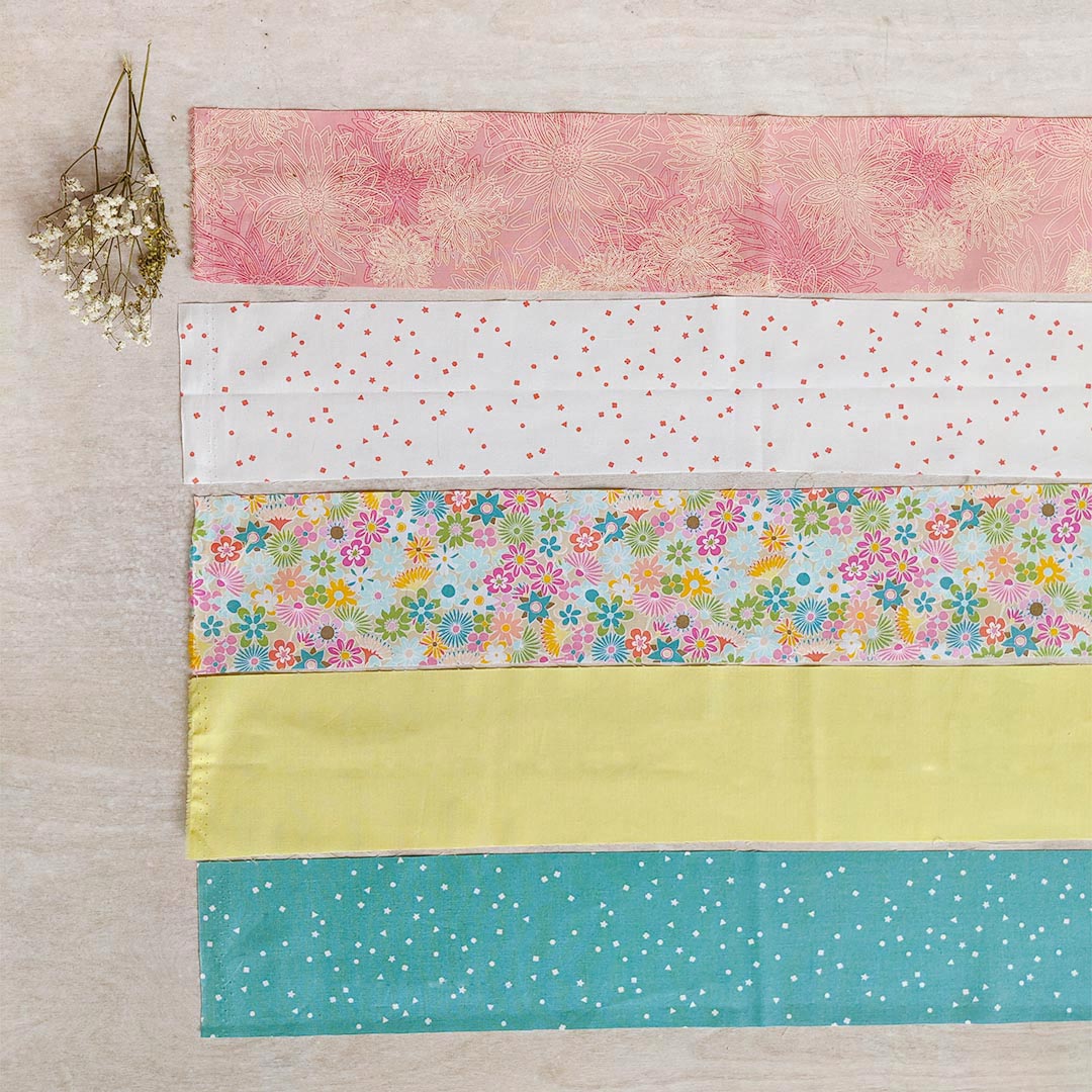 Taking advantage that Spring is still here, I choose some fabrics that are pastel tones to represent the colors of the season. I used  AGF Pure solids "Honeydew," Floral Elements in "Blush," and prints from the Playroom collection "Teeny Confetti Candy," "Flowers All Around," and "Teeny Confetti Mint."