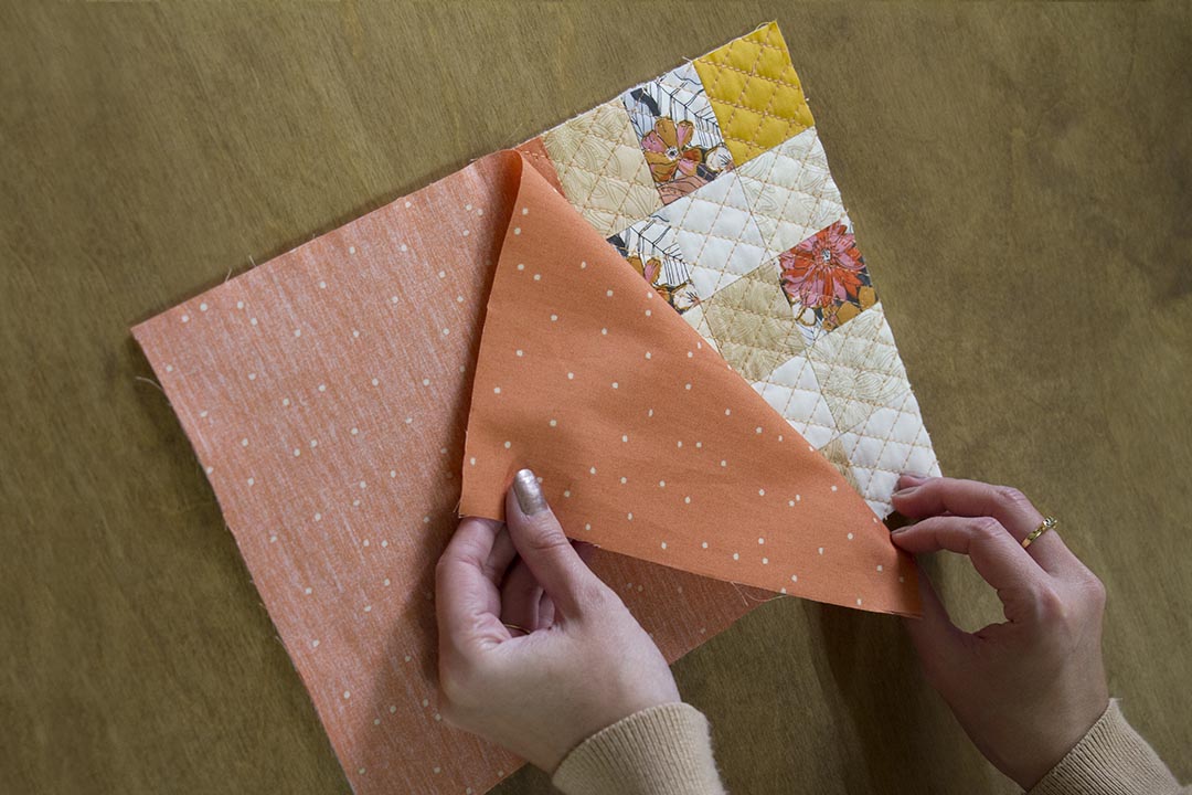 Take one (1) 7’’ x 8’’ rectangle from fabric F and the assembled piece and join them.
