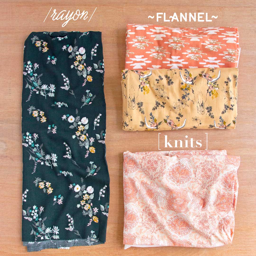 Hurrah, 4 prints are available in different substrates! There is something for everyone here, from the deep peacock color rayon print in “Intrinsic Deep” to the soft white and peachy knit print in “Paisley Bloom.” Let’s not ignore the TWO flannel prints available in “Artifact Terra” and “Woolen Blanket Rust” that would make the coziest jackets or the softest pillows ever!