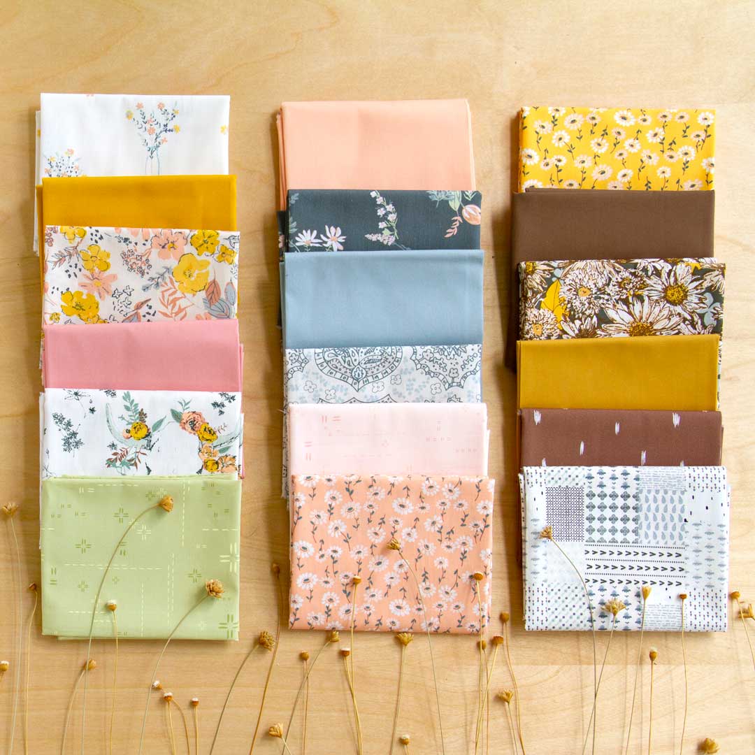 I love to see these romantic elements and hand-drawn designs in her collections, but her color palettes are always a pleasant surprise, and her latest collection Shine On is just that! Sharon created this collection last winter while dreaming of spring unfolding into winter, where nature’s promise and renewal remind us to keep glowing and growing. Spring is beginning to unfold from winter and the transitional colors of the season are present in this collection with the airy freshness of golden yellow, blushing peach, sepia, and milky white efflorescence.