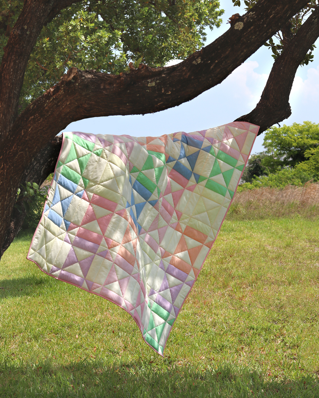 All you need are two 10” squares of fabric to create one of the blocks for this playful quilt. This magical technique is fantastic because you do less sewing and the magic happens in the horizontal and vertical cutting and the rearranging of your cut pieces. If you haven’t tried this block yet you are in for a real satisfying treat! Like the table runner you will be in pastel bliss arranging your finished blocks to create your quilt top!