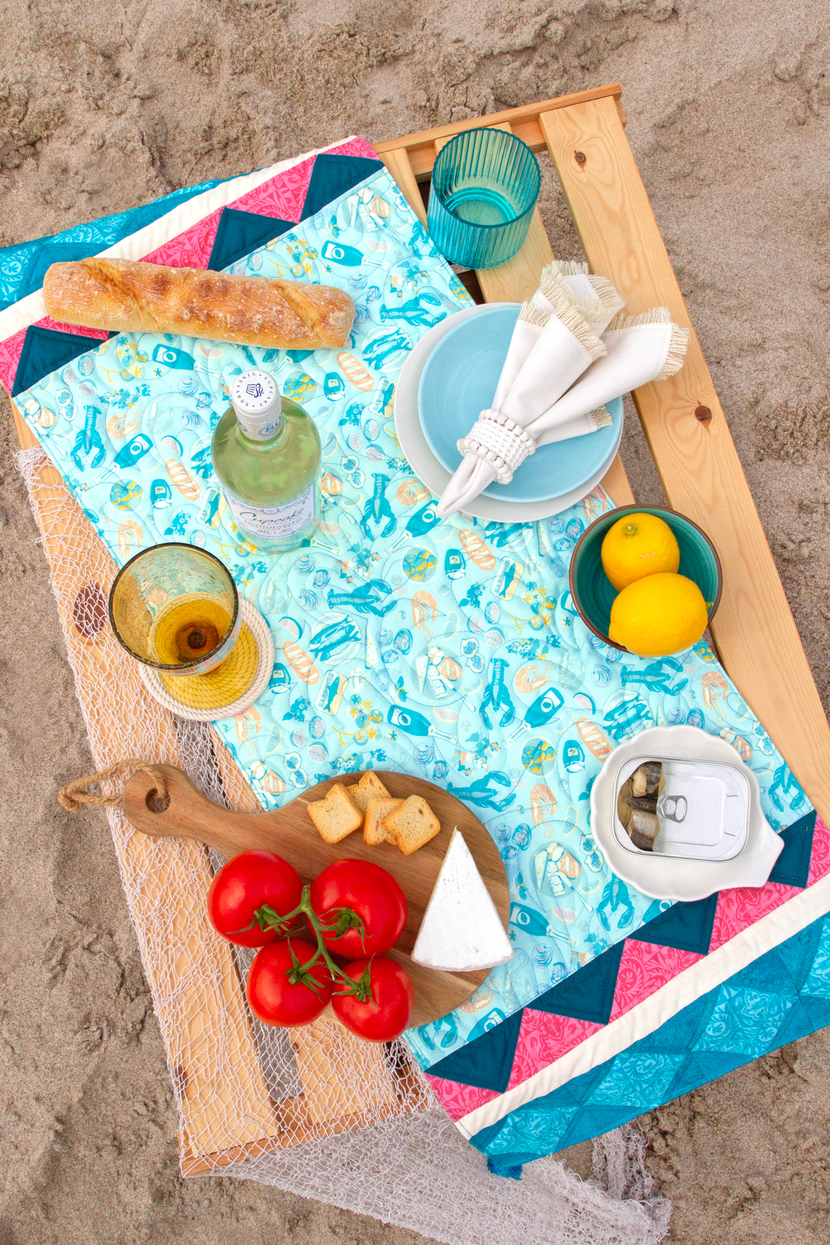 Besides sewing, eating good food from different places around the world is something that makes me really happy! So of course “Gosto Da Costa Fresca” is one of my favorite prints showcasing the yummy cuisine of Costeira. I love how this print turned out in the “Continuous Tablerunner” pattern. For the border we used the mosaic tile print, “Azulejos Rosados” and “Azulejos Azuis” mixed with the pure solids and floral elements! Ideal runner for summer backyard get-togethers!