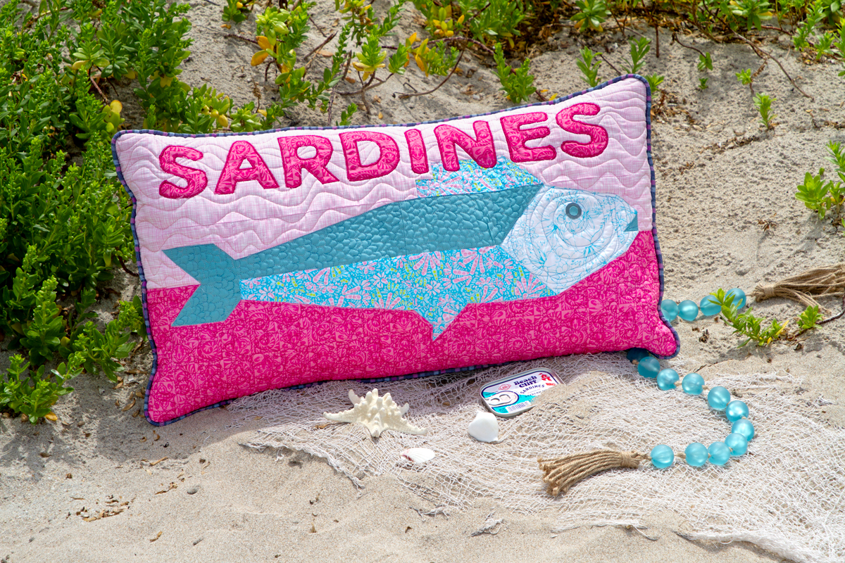 The sardine print in this collection is so iconic and is trending really hard right now. I love the fresh pastel colors and placement of the sardine cans which is perfect for fussy cutting. We were inspired by this print to create this sardine patio pillow following the design of the print!
