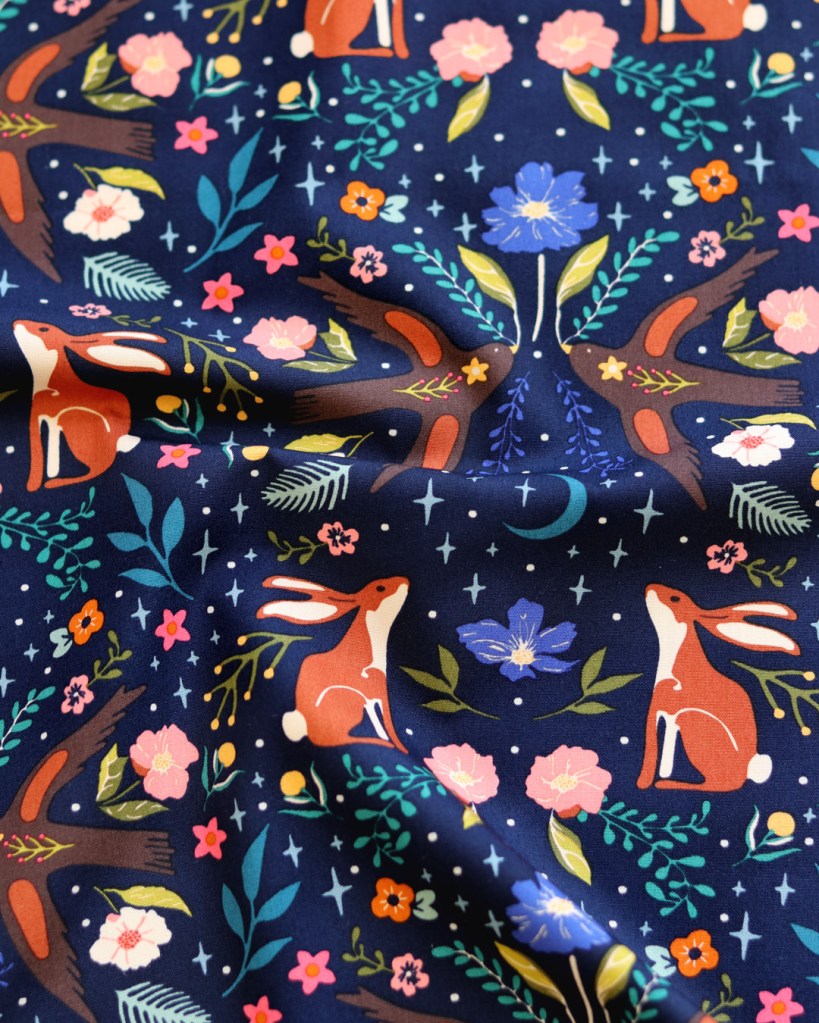 “Moonlit Forest Dusk” showcases a twilight sky and crescent moons with majestic birds, rabbits, and nature elements that come to life. A great all over print to use in apparel, home decor and even fussy cut projects.