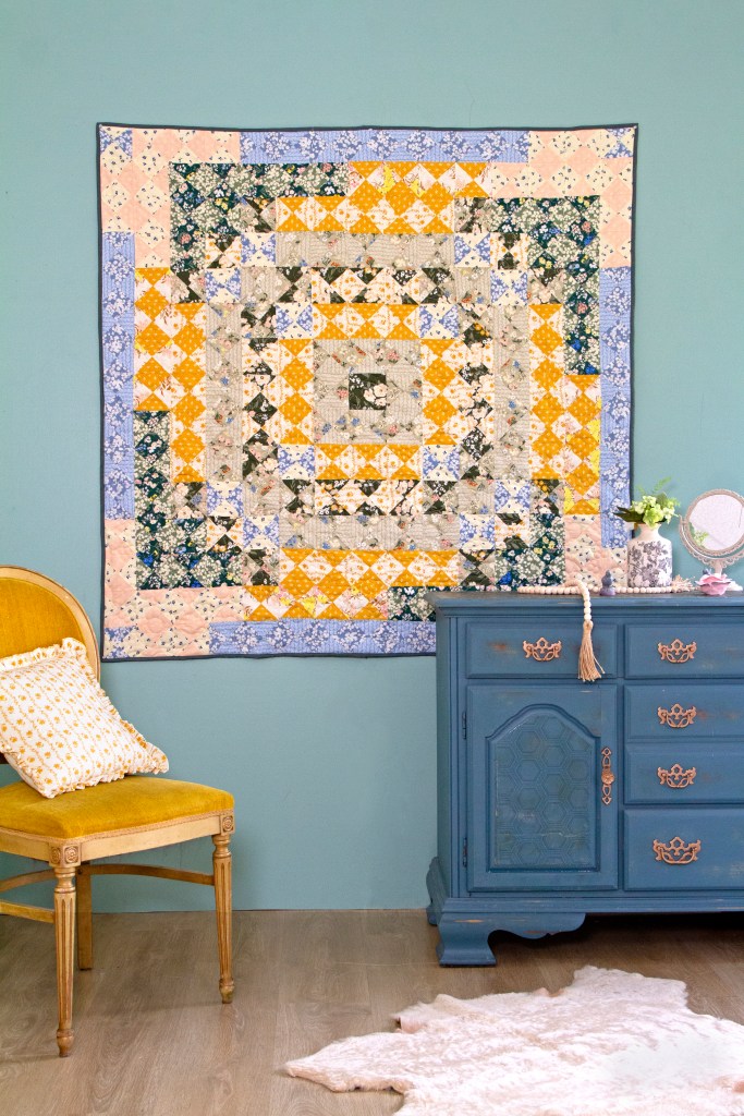 Grab yourself 2 packs of 10” Square Fabric Wonders from Bonnie Christine’s collection called, ‘A Year in Petals’ and sew up this 52 ½” × 52½” quilt entirely made up of hour glass blocks. I love how great each hour glass block showcases the prints, as it borders around one single solid fabric block in the middle of your quilt creating a spiral effect.