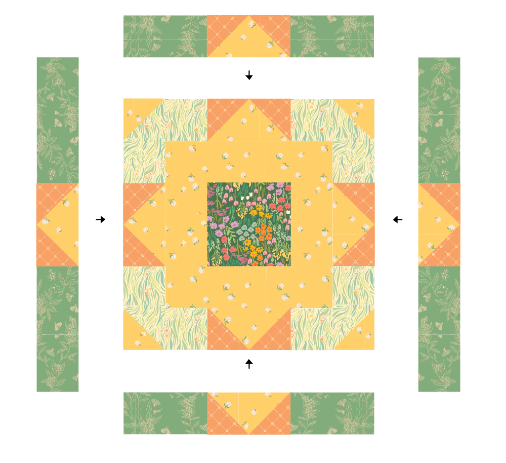 Sew your bottom and top rows to each side of your block and then sew your side rows making sure the flying geese units are facing away from the center of your block!