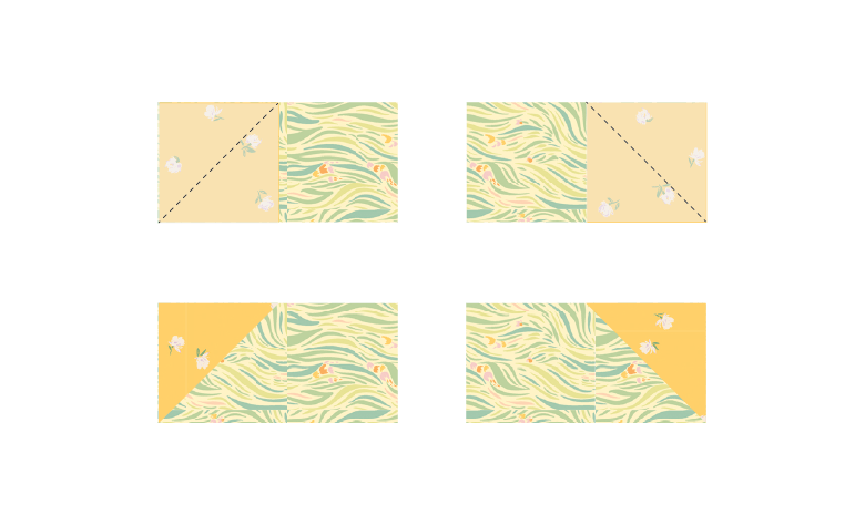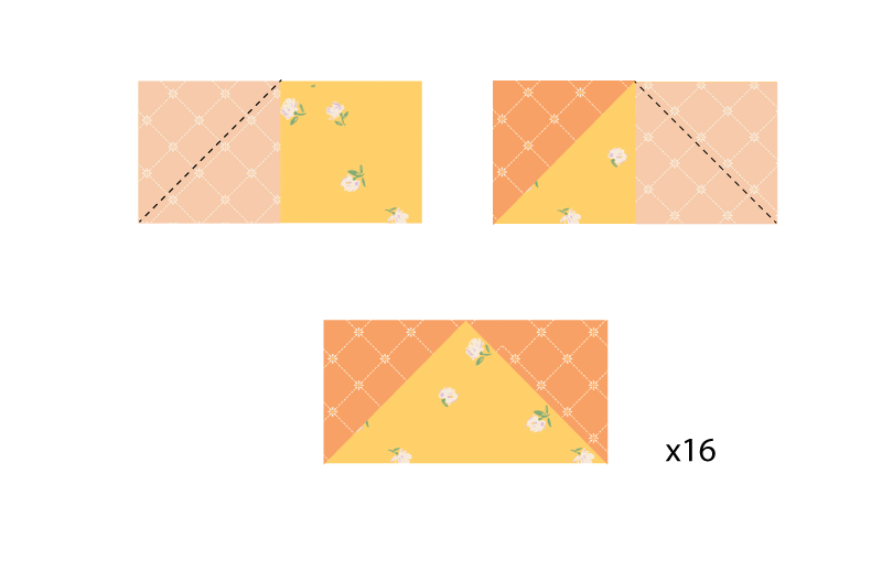 Now take four 2” squares and draw a line corner to corner on the wrong side of fabric. Place it at the end of four 2” x 3 1/2” strips from Fabric G as follows to create two of each unit.