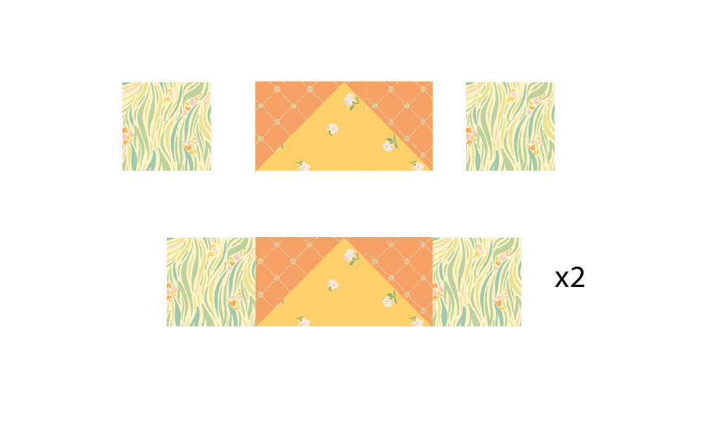 Sew your units as follows to each side of a flying geese unit . Make two of these rows.